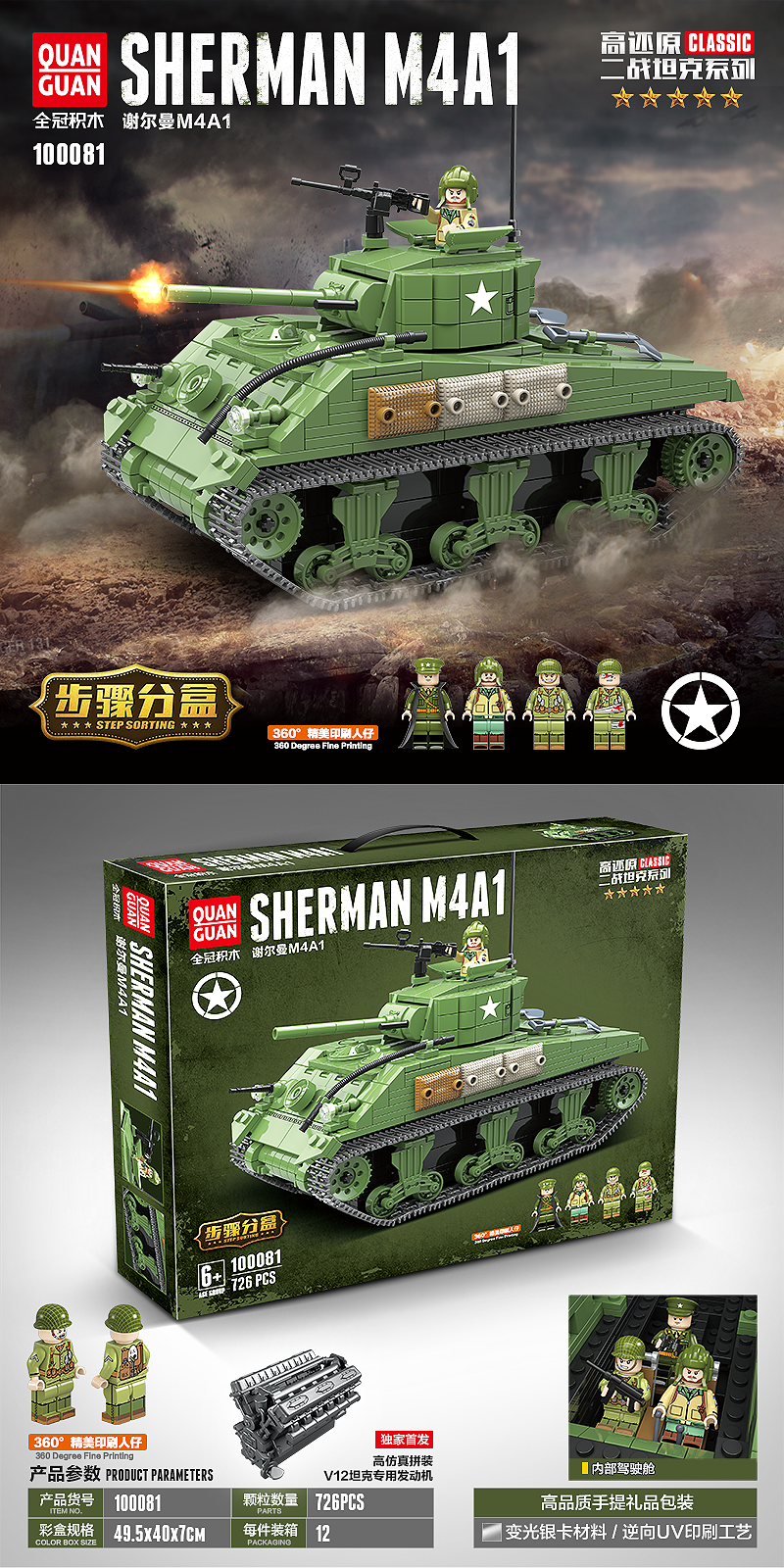 二战坦克:谢尔曼M4A1坦克(Sherman M4A1)属于军事系列积木套组,整个套组包含 726 个积木颗粒。首发于2019年。
