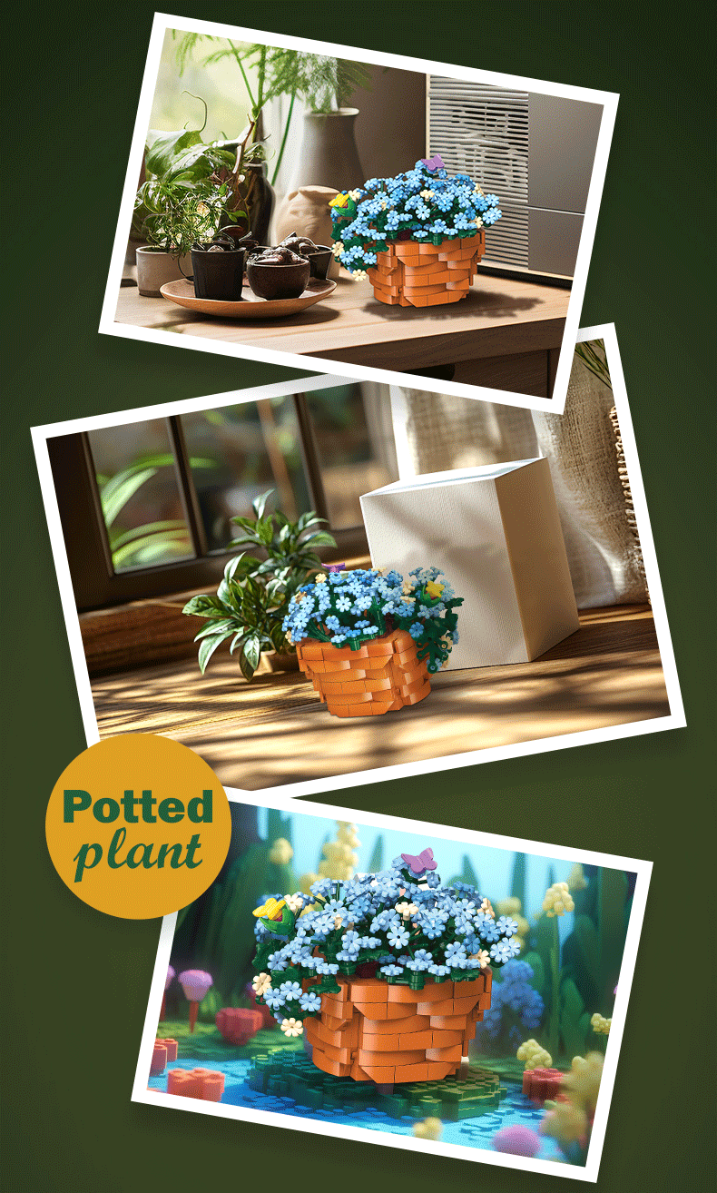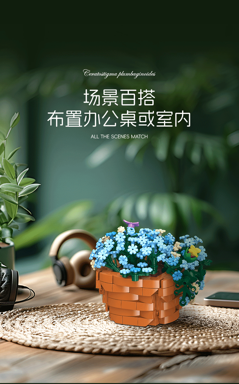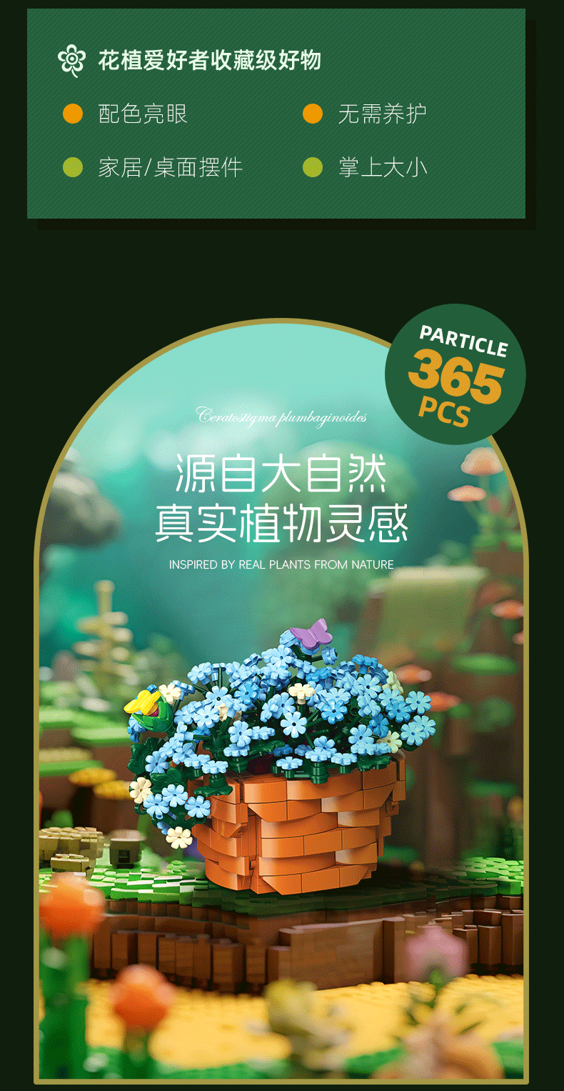 蓝雪花盆栽(Ceratostigma Plumbaginoides)属于花卉植物系列积木套组,整个套组包含 365 个积木颗粒。首发于2024年。