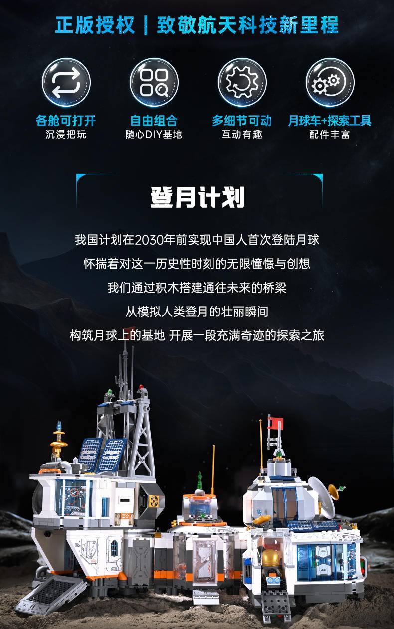月球基地(实验舱、气闸舱)属于太空系列积木套组,整个套组包含 790 个积木颗粒。首发于2024年。