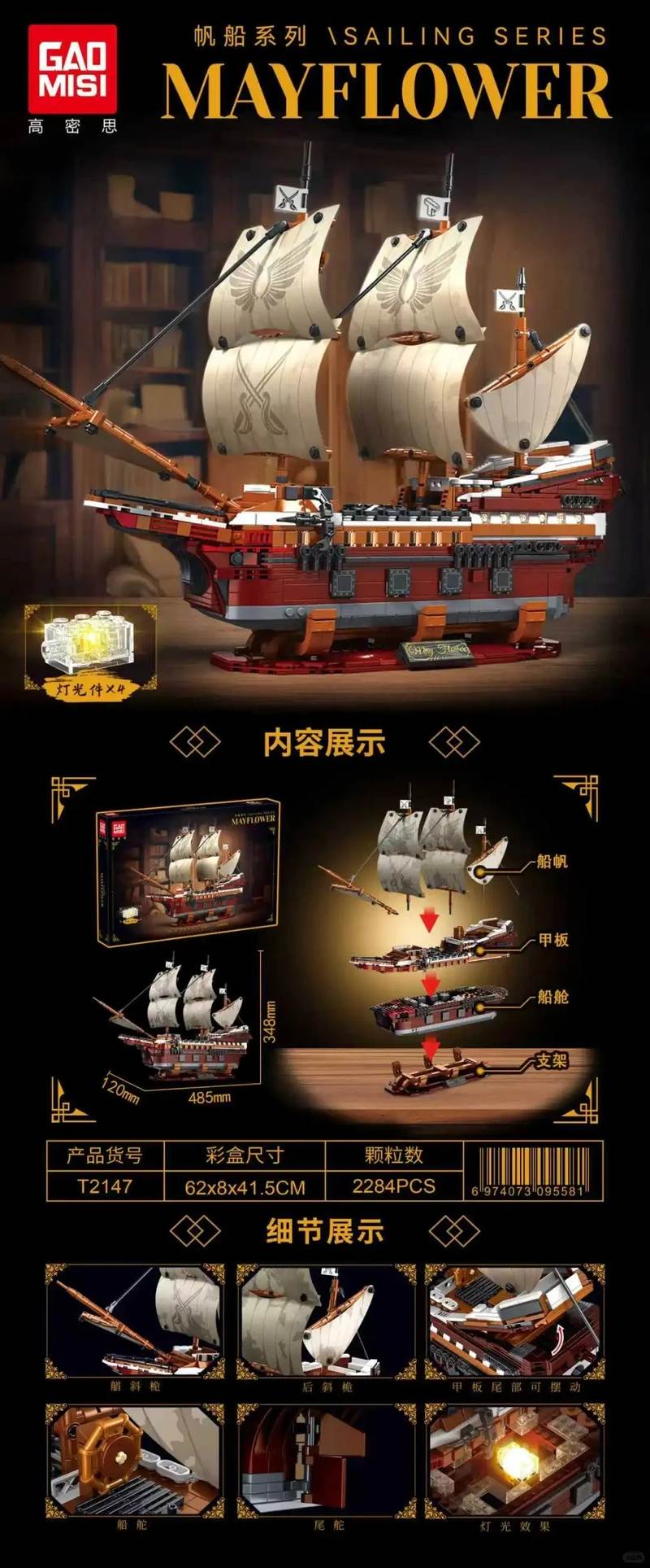 五月花号帆船属于海盗系列积木套组,整个套组包含 2076 个积木颗粒。首发于2025年。