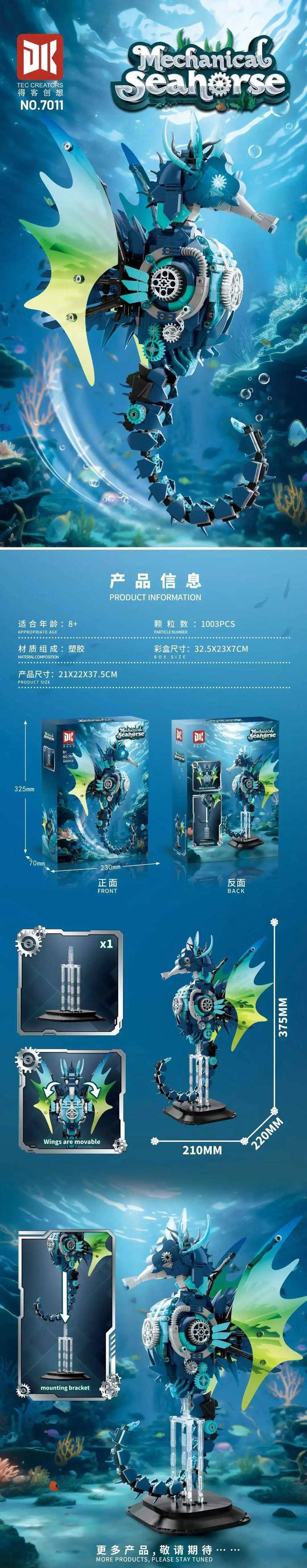 机械海马(Mechanical Seahorse)属于主题系列系列积木套组,整个套组包含 1003 个积木颗粒。首发于2025年。