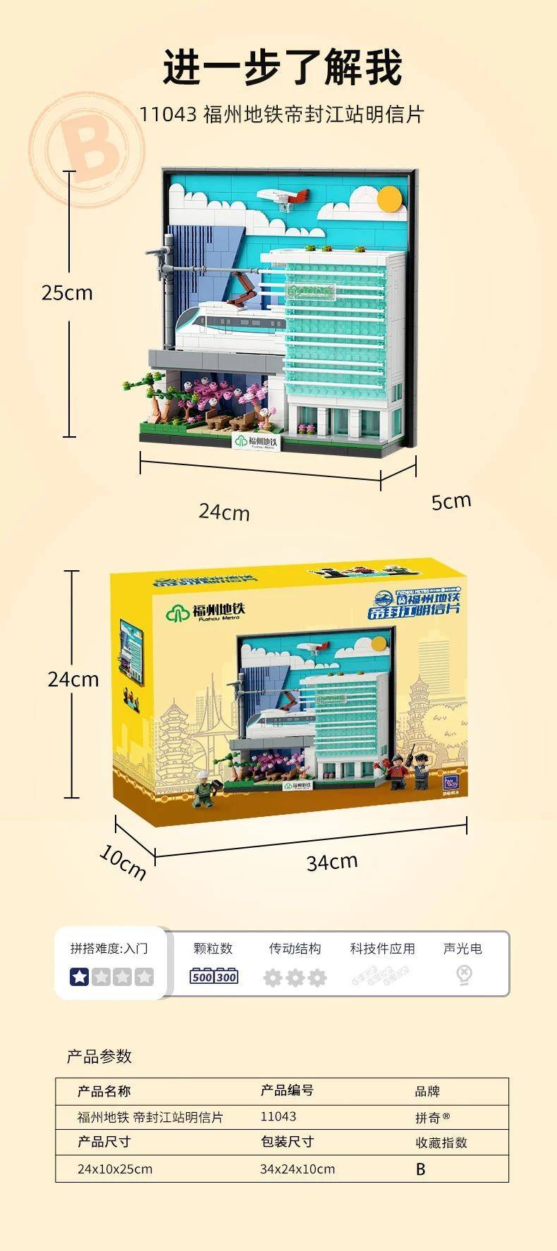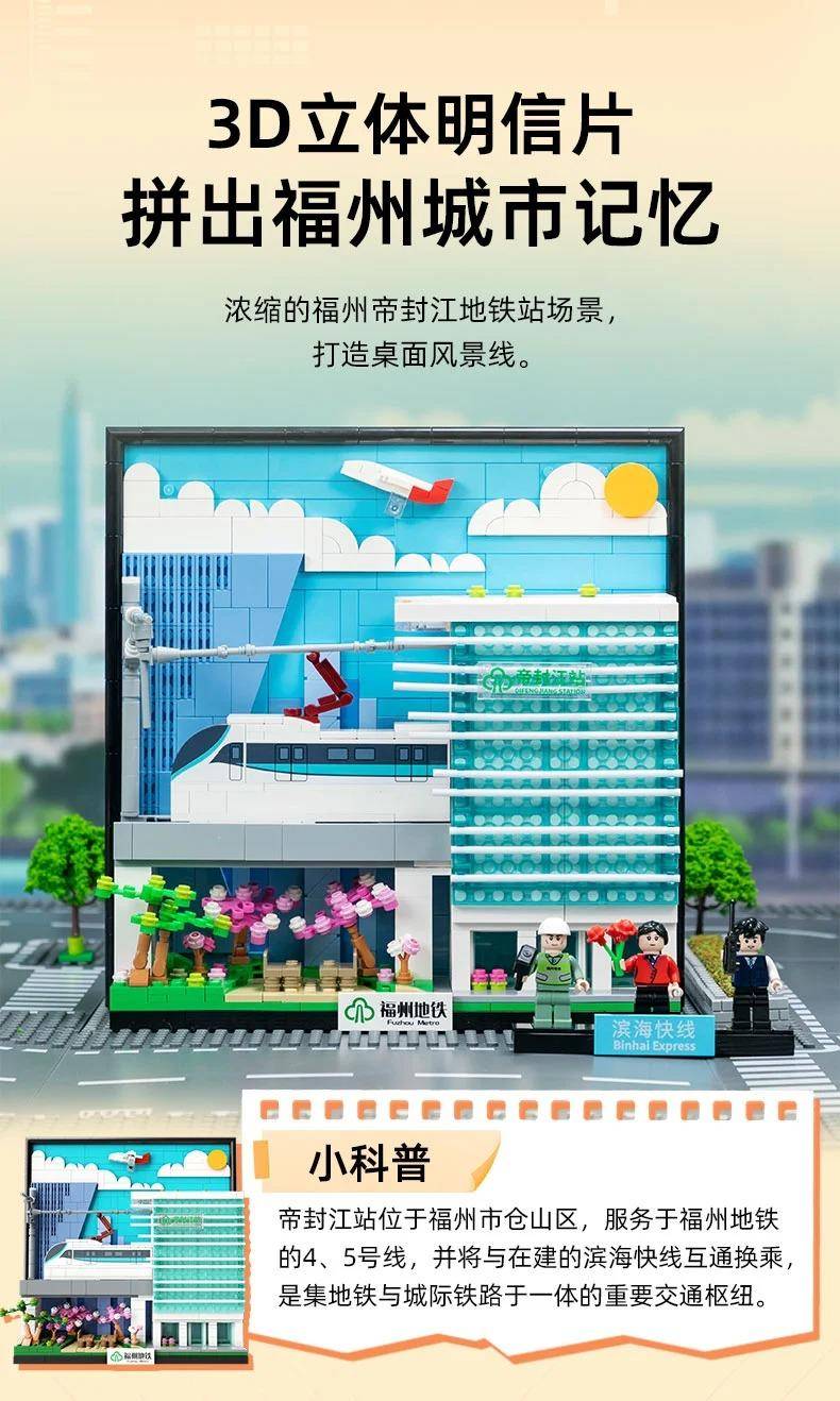 福州地铁 帝封江站明信片属于建筑系列积木套组,整个套组包含 800 个积木颗粒。首发于2025年。