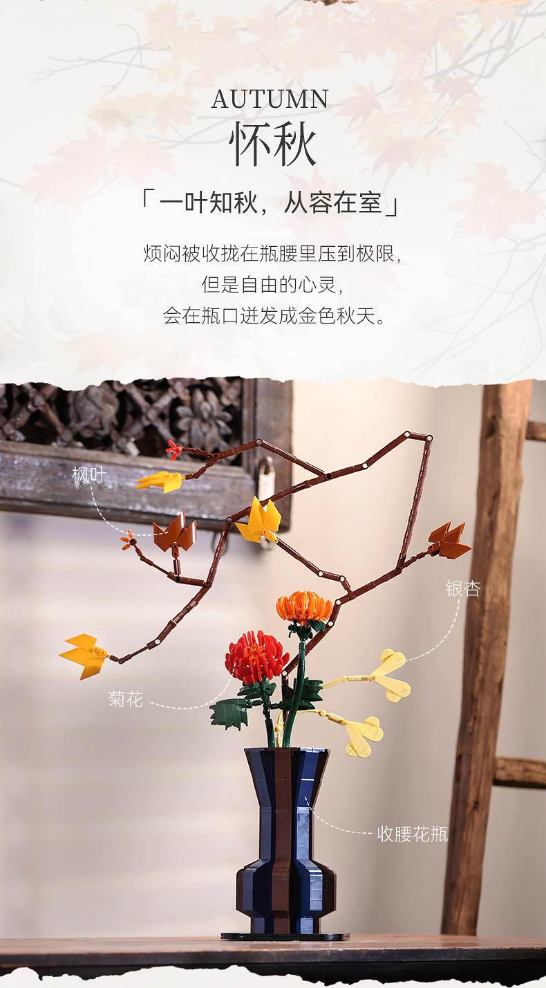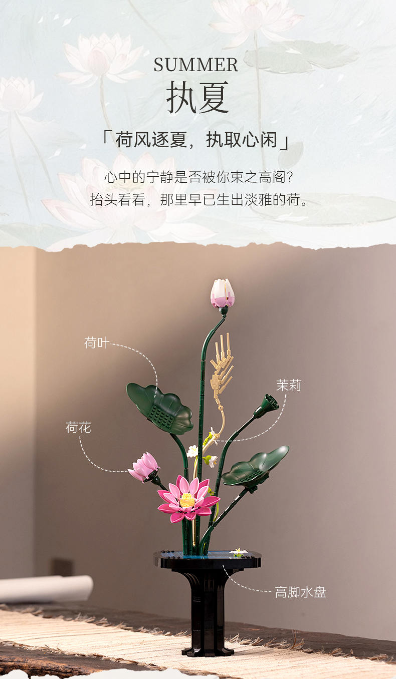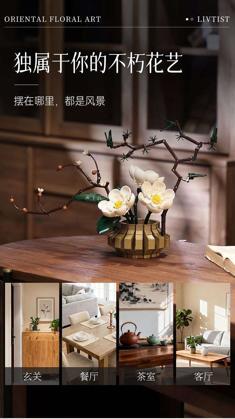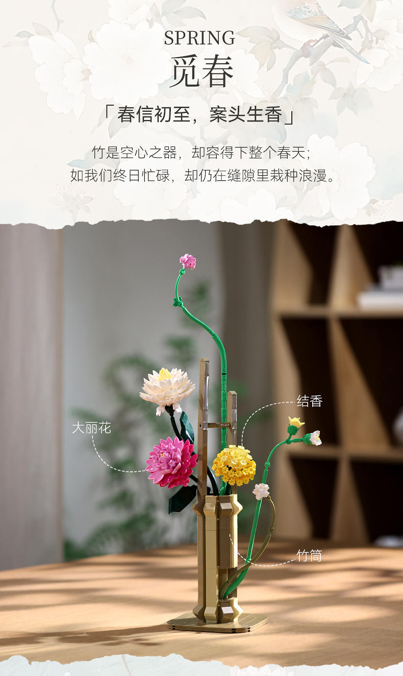 Livtist中式花艺:觅春属于花卉植物系列积木套组,整个套组包含 637 个积木颗粒。首发于2025年。