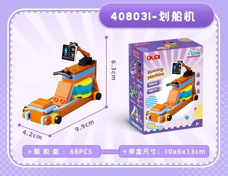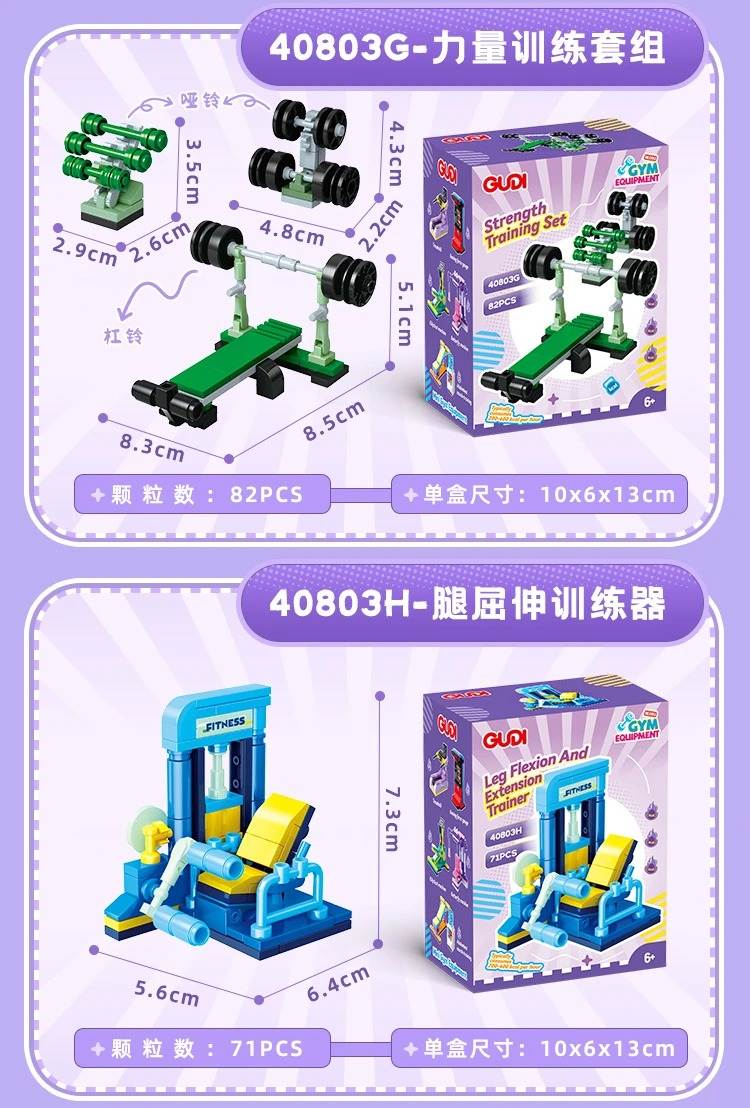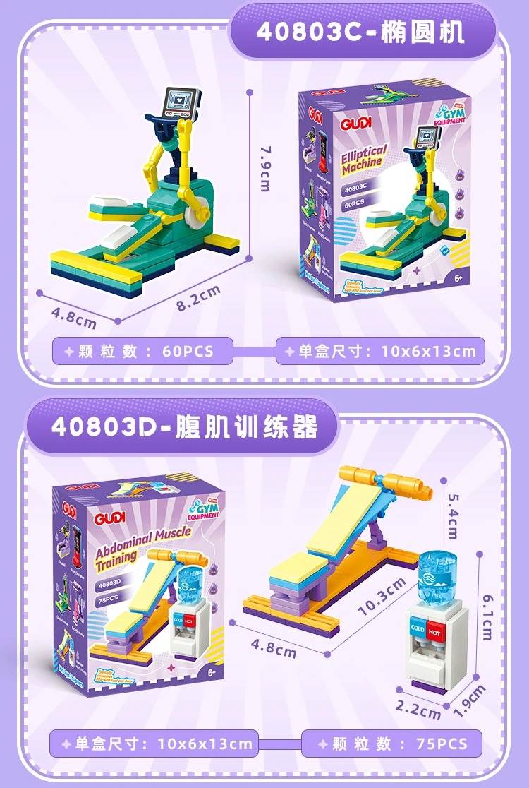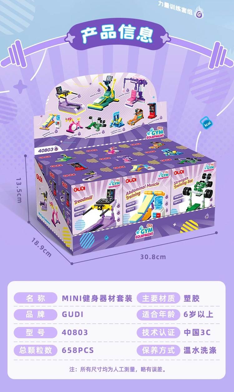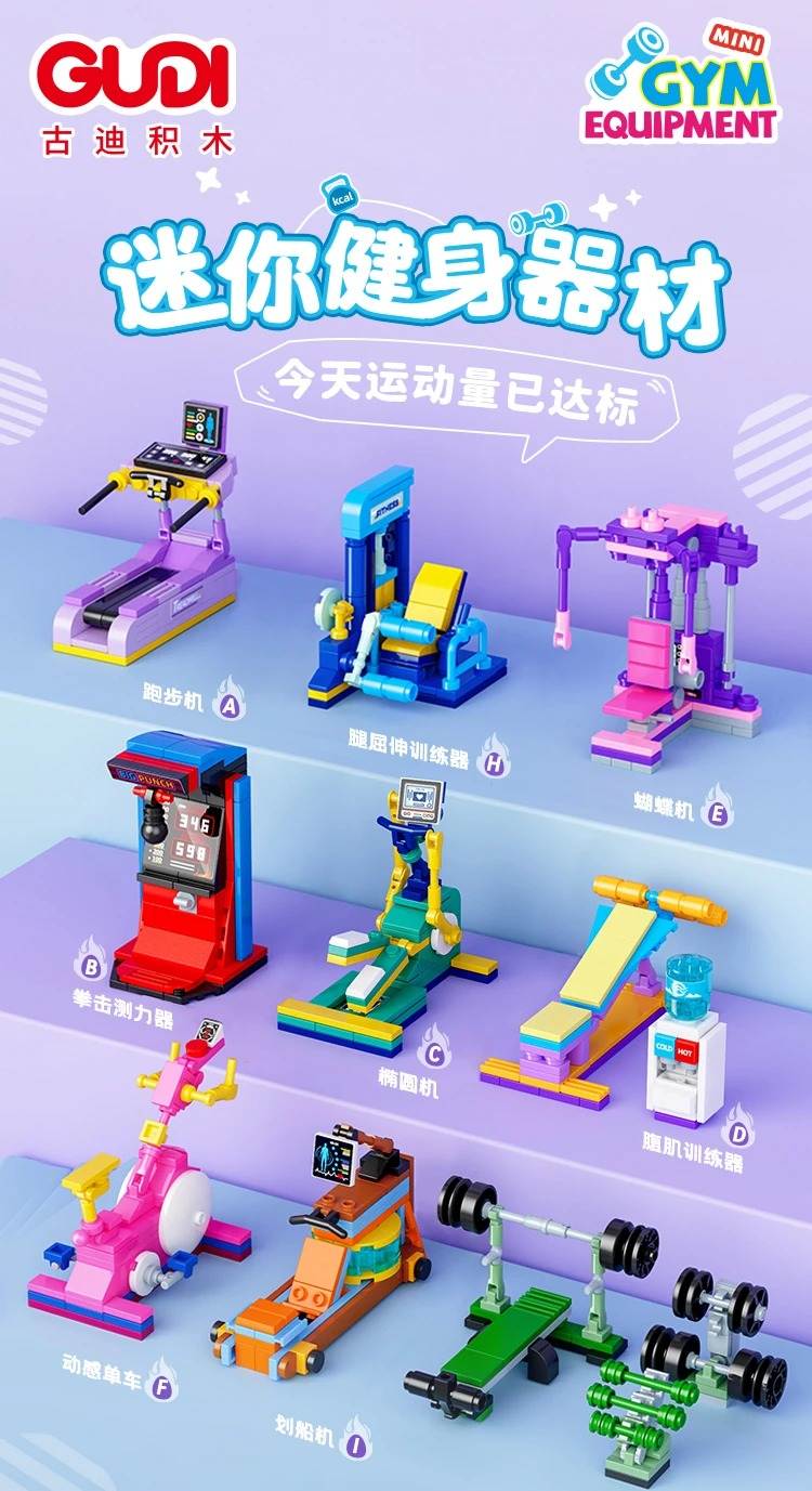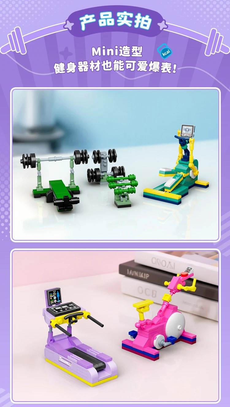 迷你健身器材 9款 跑步机、拳击测力器、椭圆机、腹肌训练器、蝴蝶机、动感单车、力量训练套组、腿屈伸训练器、划船机属于创意百变系列积木套组,整个套组包含 658 个积木颗粒。首发于2025年。