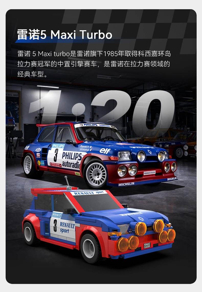 雷诺 5 Maxi Turbo 编程双模遥控版 1:20属于车模系列积木套组,整个套组包含 282 个积木颗粒。首发于2025年。