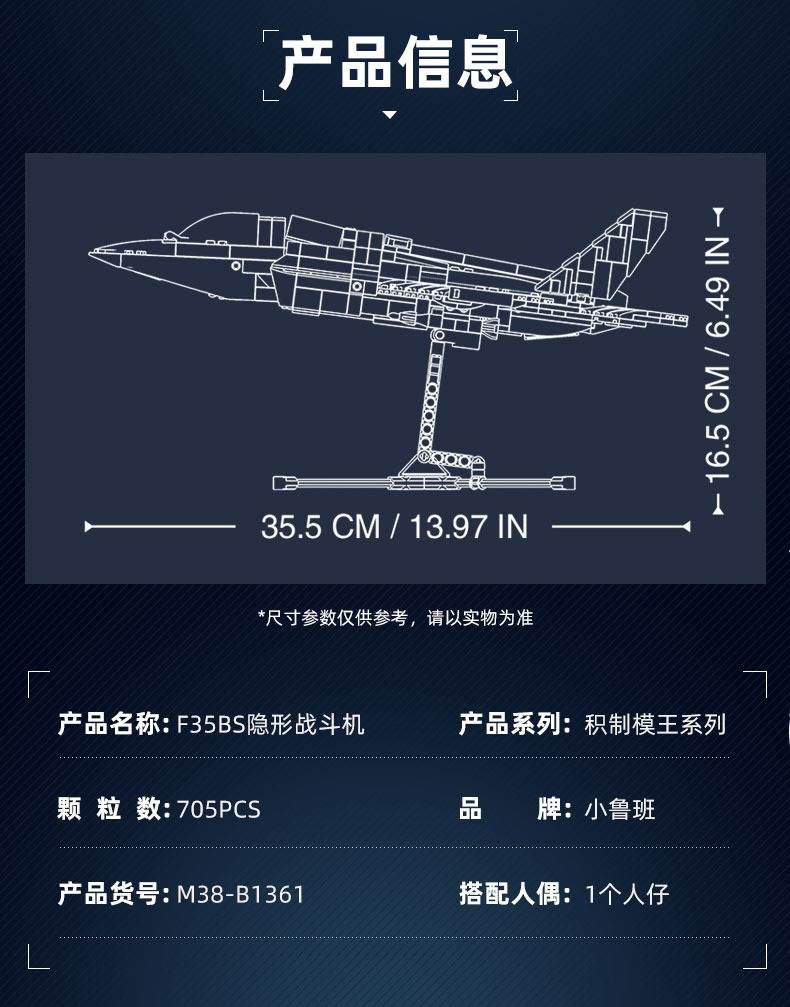 积制模王:F35B隐形战斗机 1:44属于军事系列积木套组,整个套组包含 705 个积木颗粒。首发于2025年。