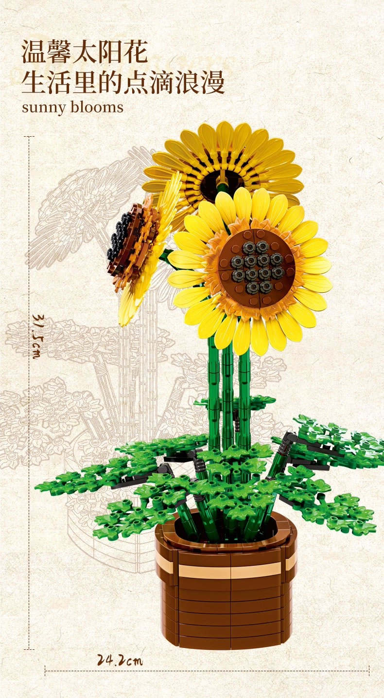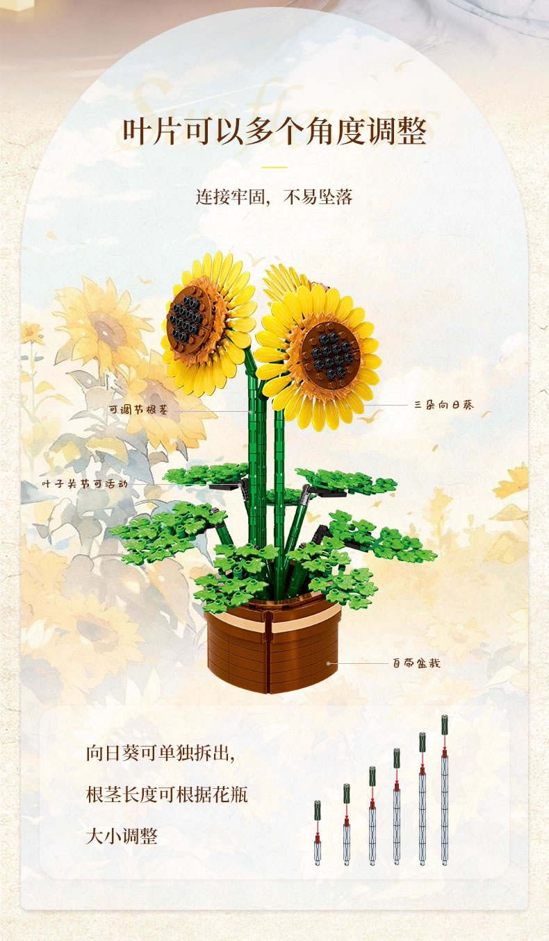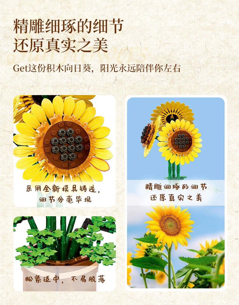 向日葵(Sun Flower)属于花卉植物系列积木套组,整个套组包含 739 个积木颗粒。首发于2025年。