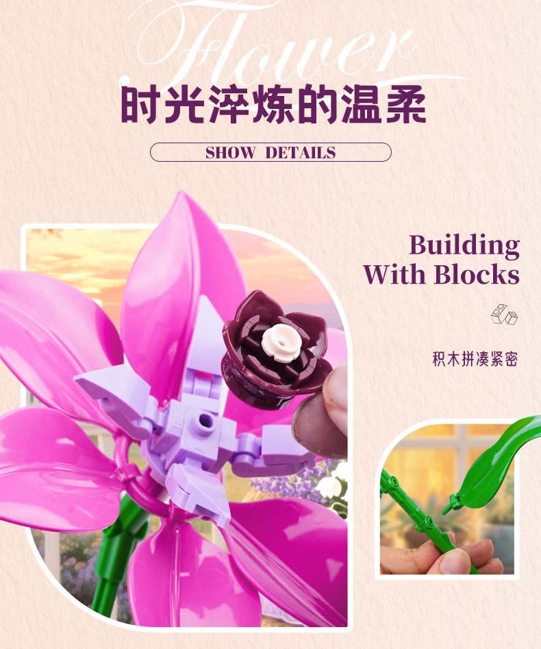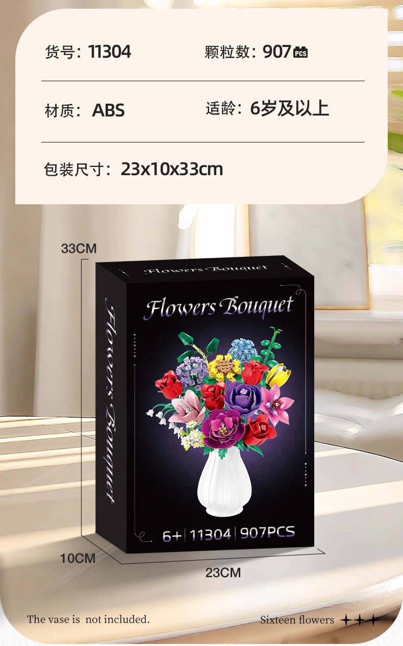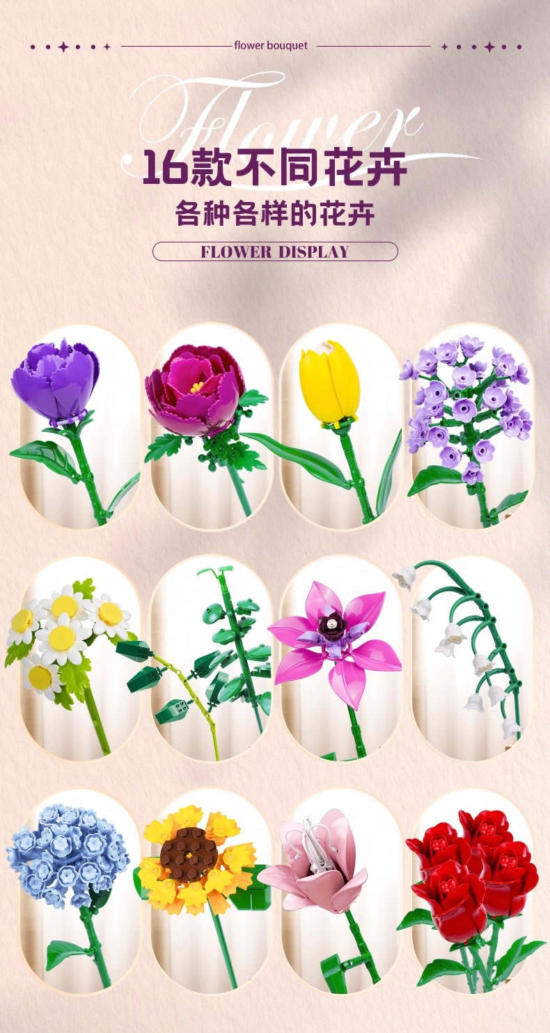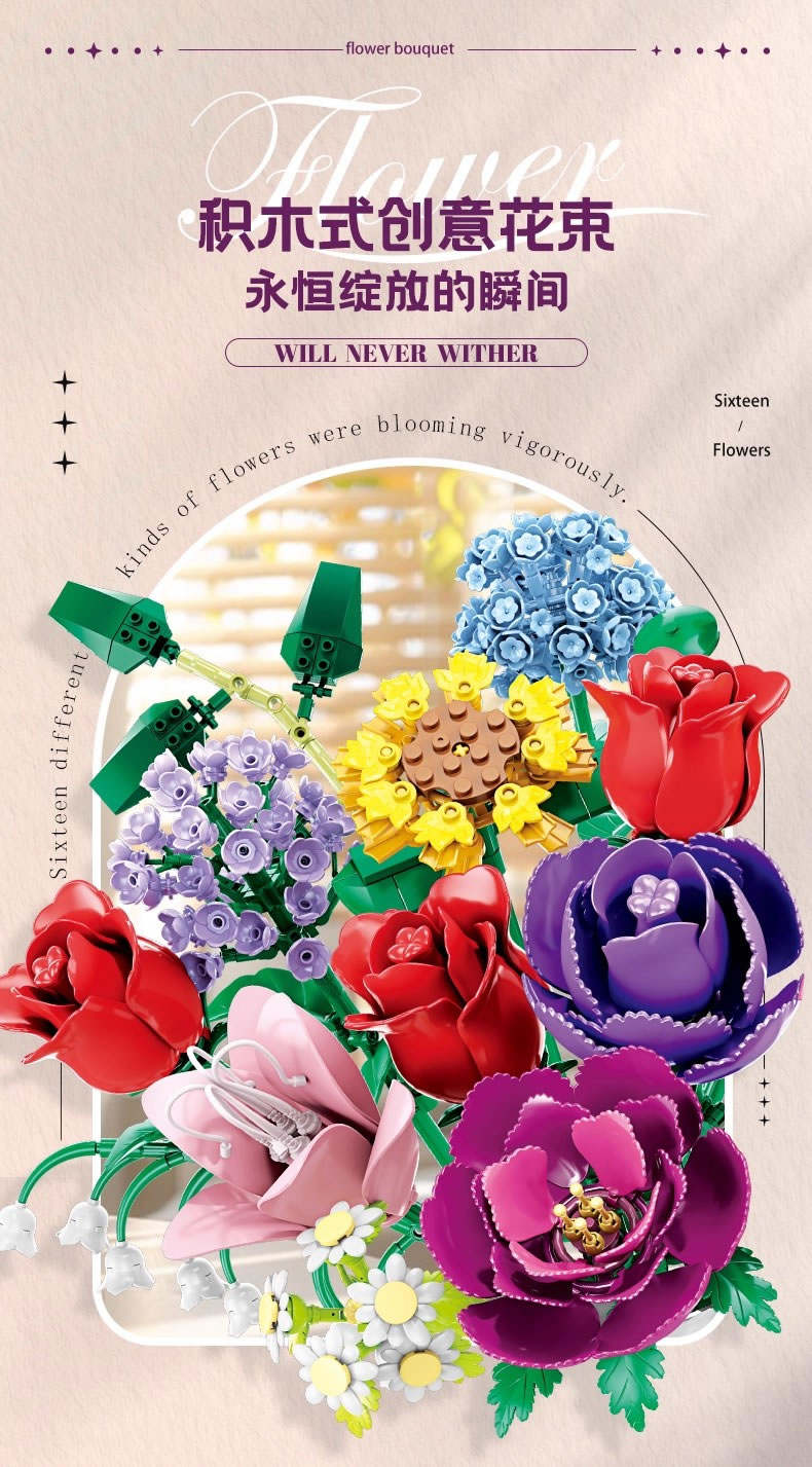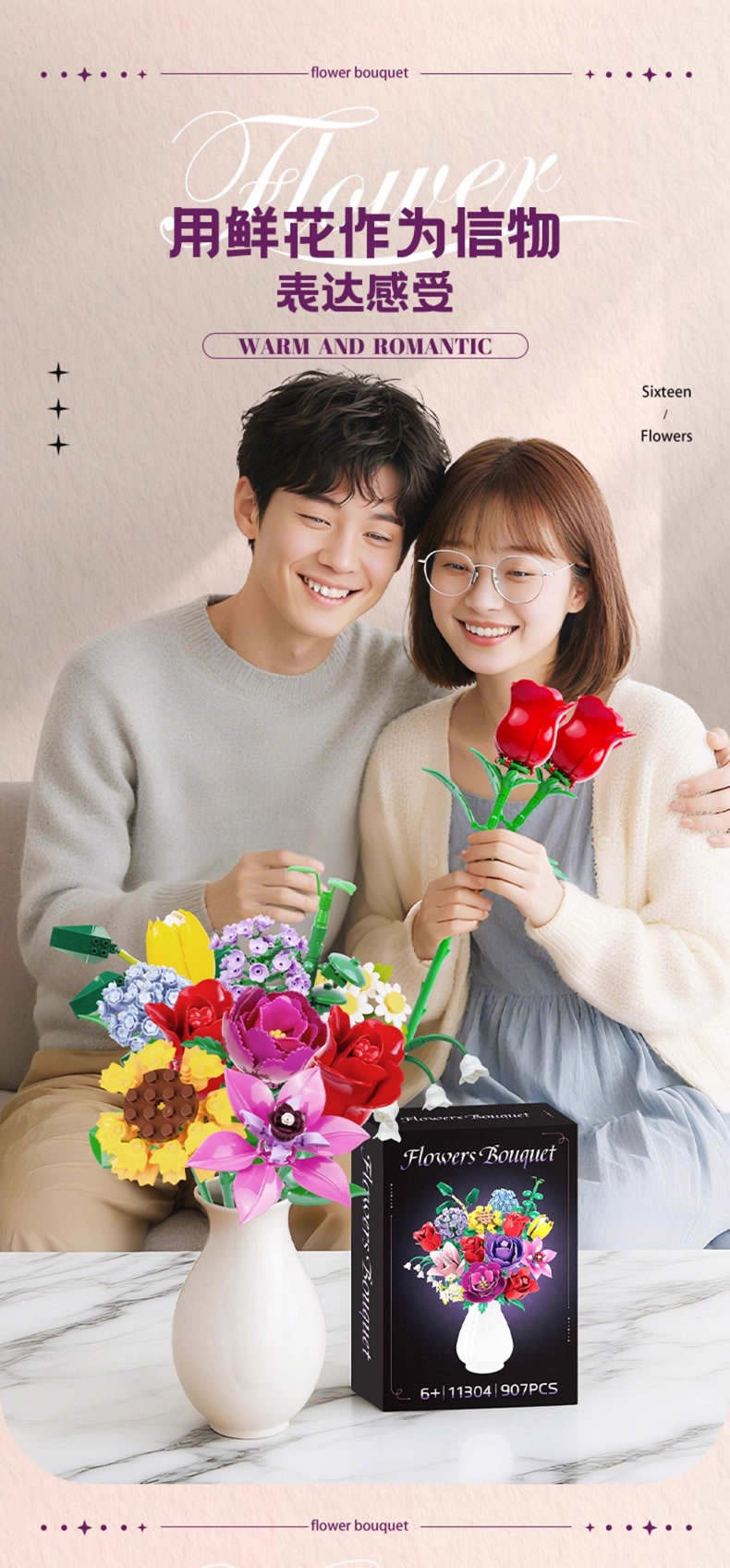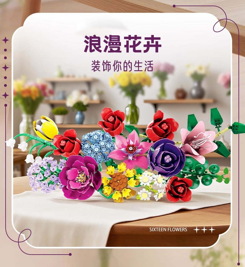 浪漫时光16朵(Flowers Bought)属于花卉植物系列积木套组,整个套组包含 907 个积木颗粒。首发于2025年。