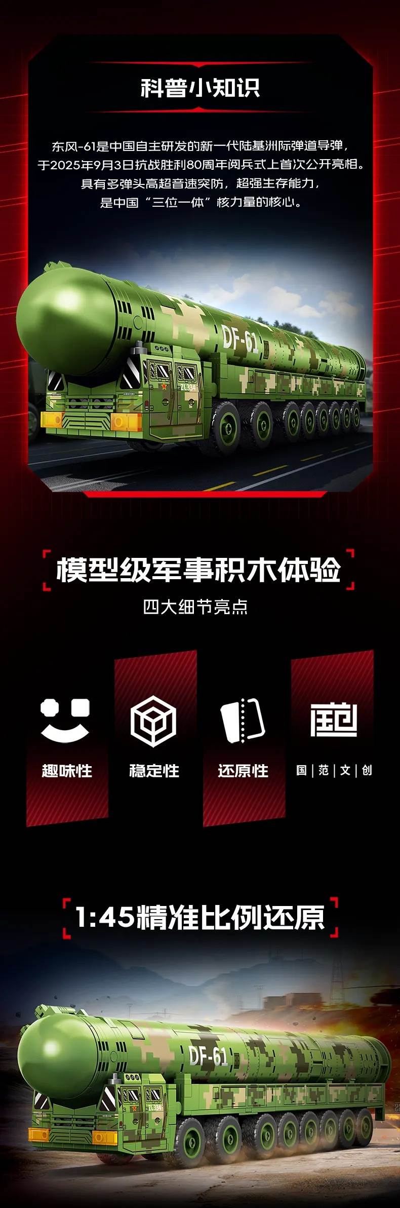 东风-61洲际导弹 1:45属于军事系列积木套组,整个套组包含 551 个积木颗粒。首发于2025年。