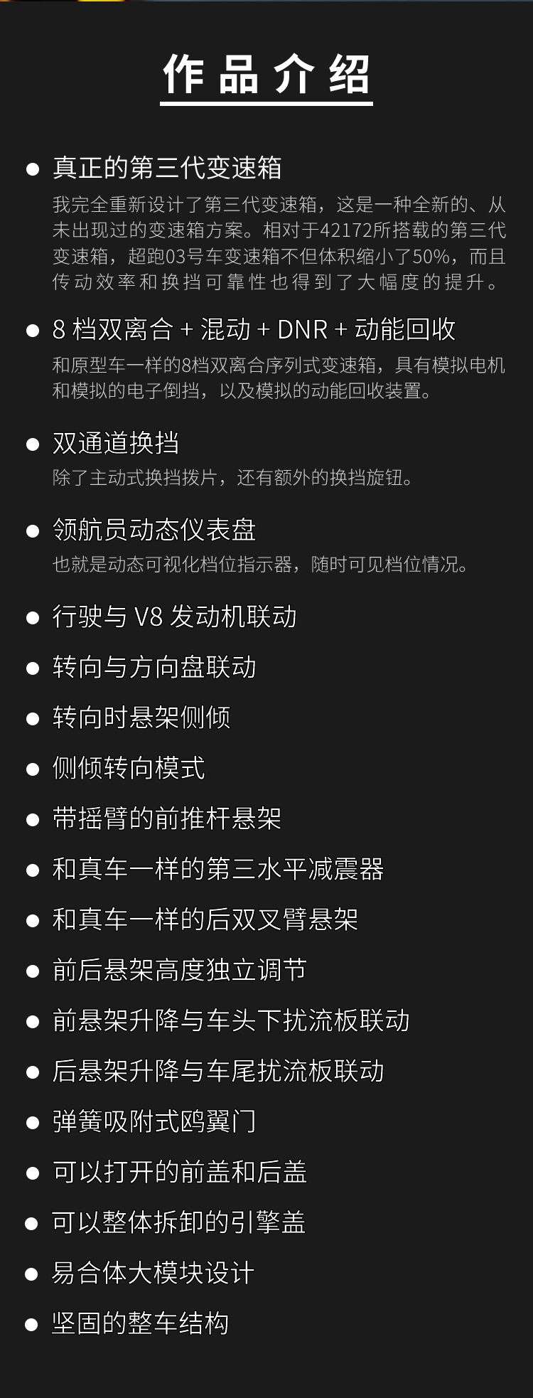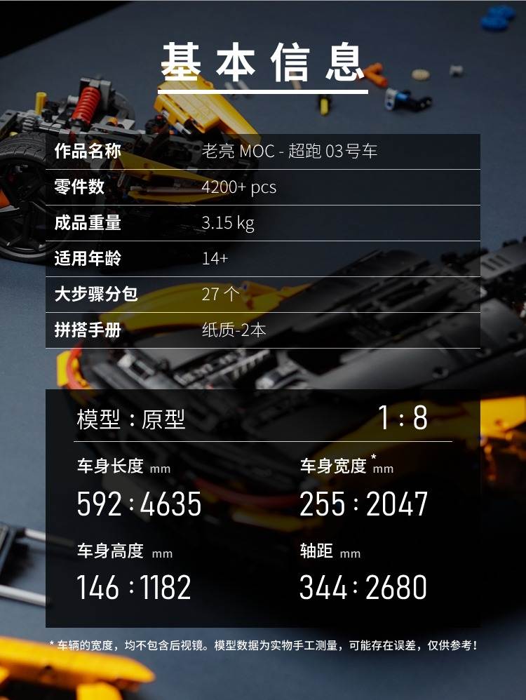 超跑03号车 1:8(McLaren W1)属于1:8系列积木套组,整个套组包含 4200 个积木颗粒。首发于2025年。