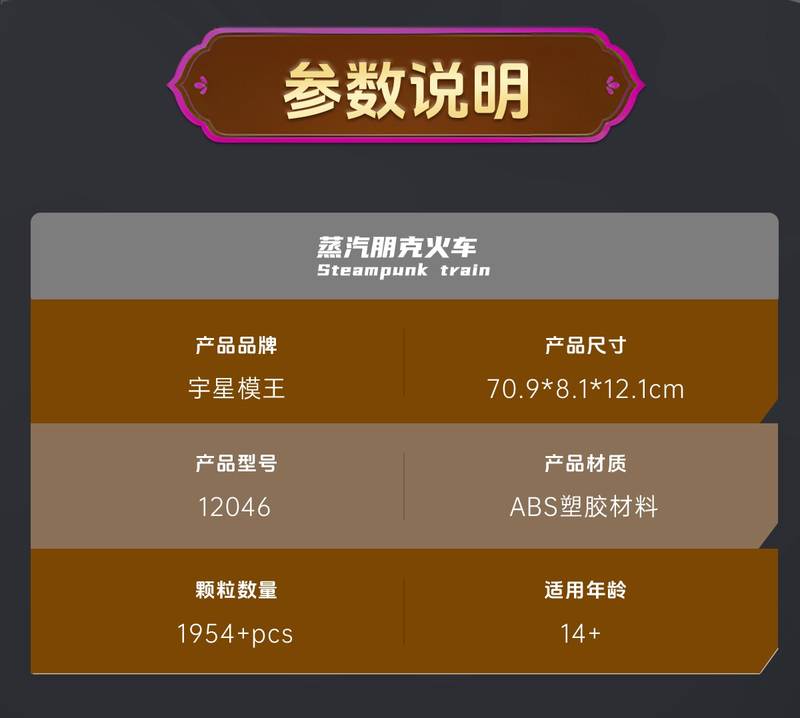 蒸汽朋克火车(Steampunk Train)属于火车系列积木套组,整个套组包含 1954 个积木颗粒。首发于2025年。