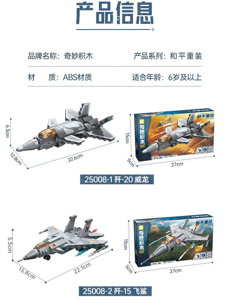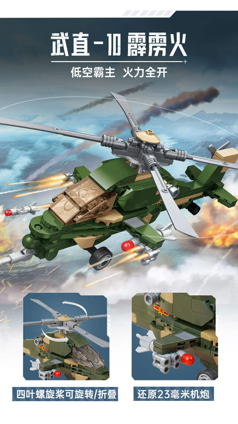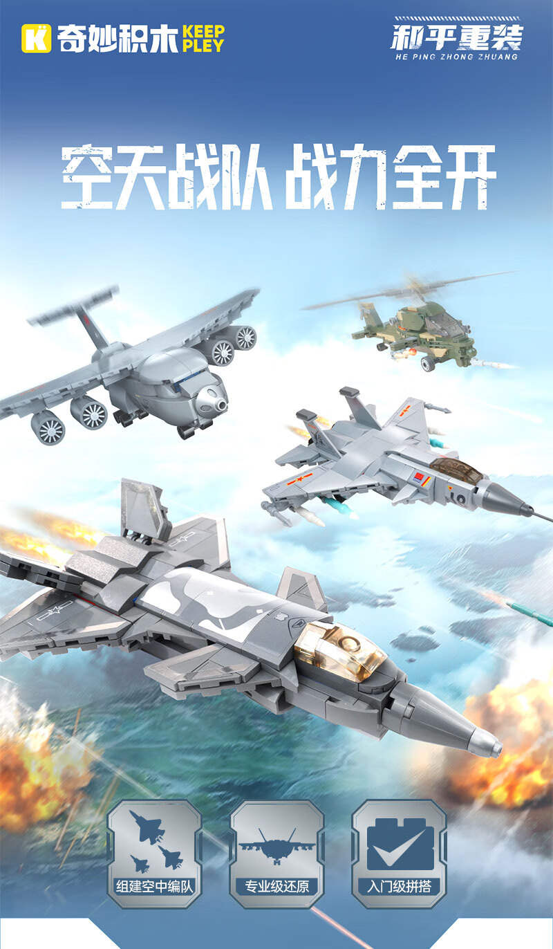 和平重装:空中编队 4款 歼-20 威龙、歼-15 飞鲨、运-20 鲲鹏、武直-10 霹雳火属于军事系列积木套组。首发于2025年。