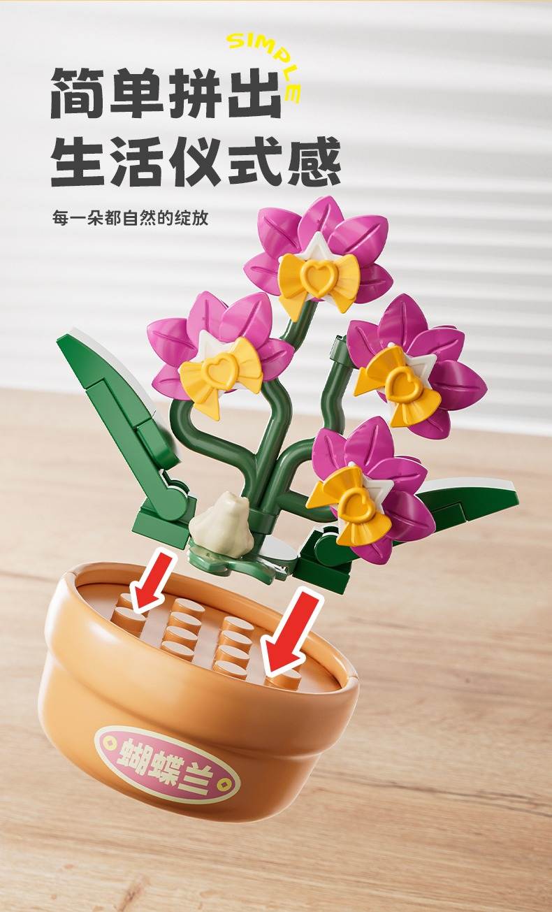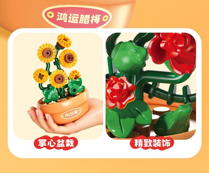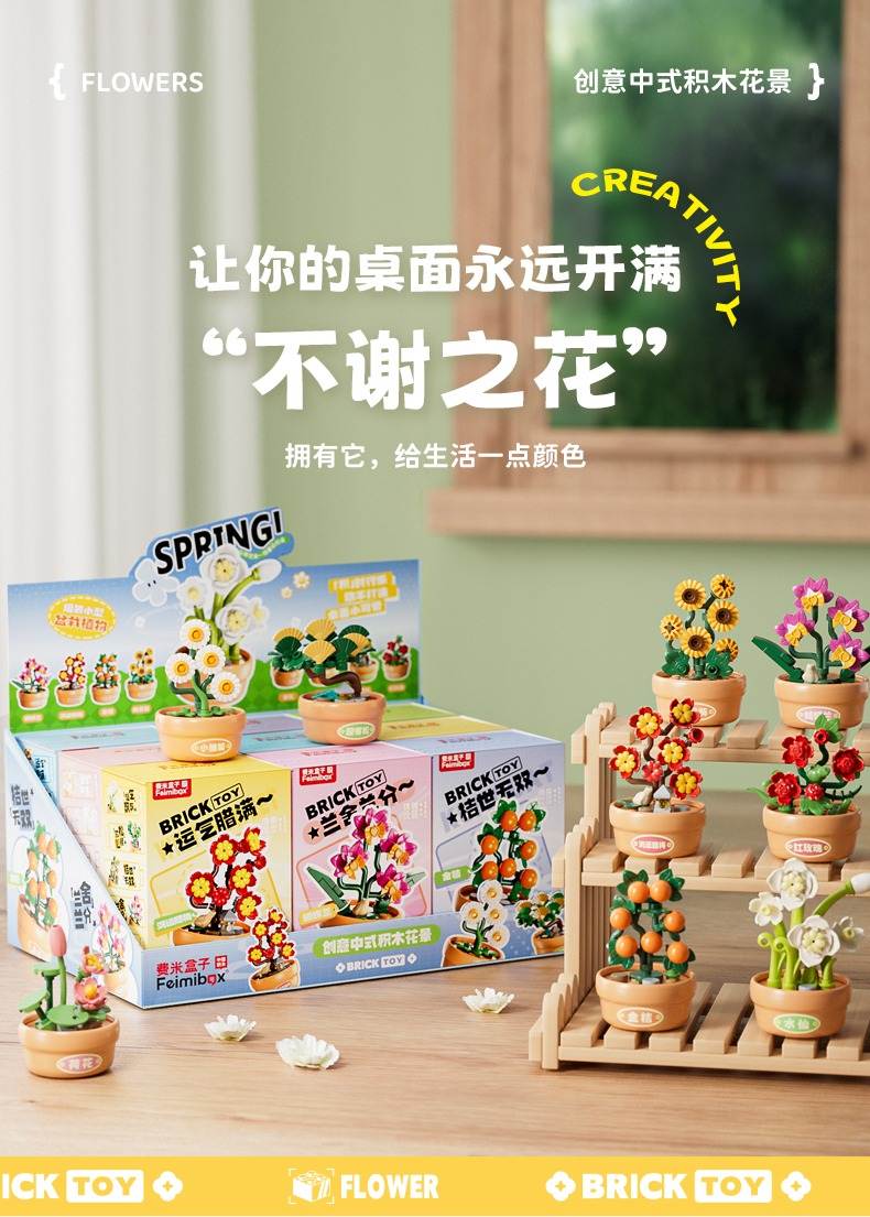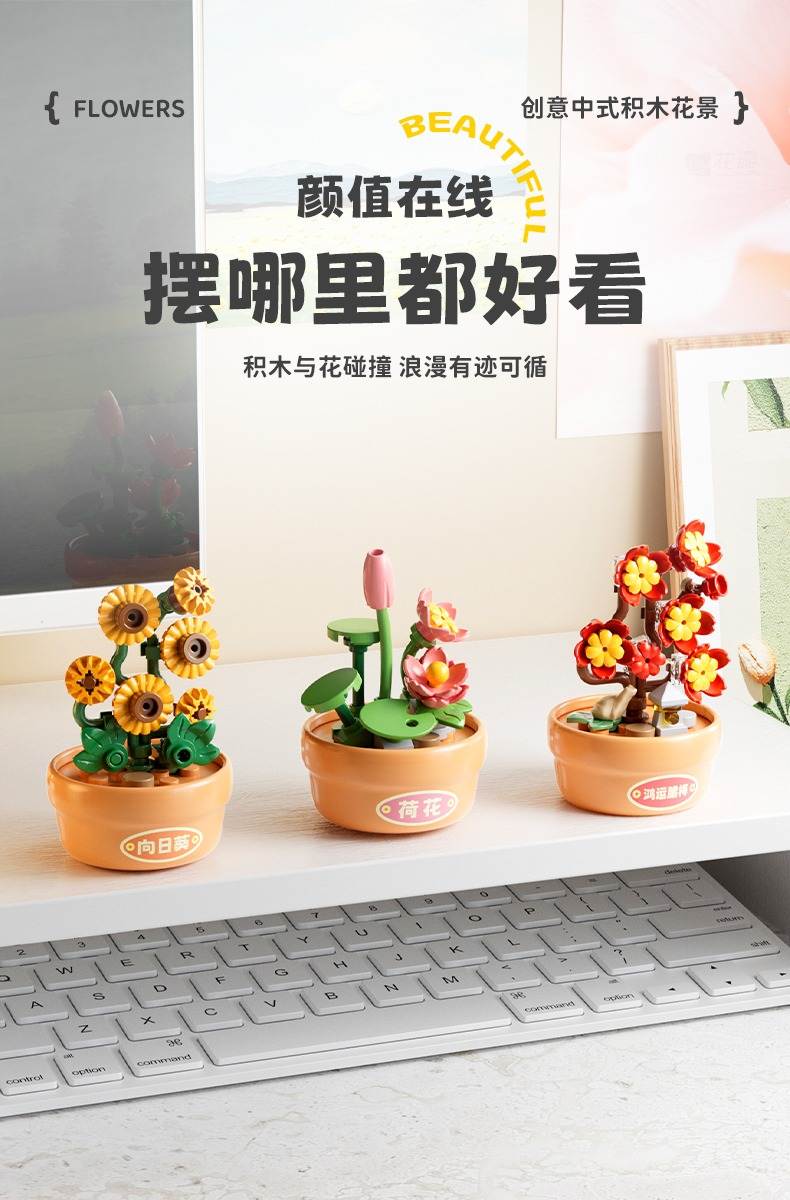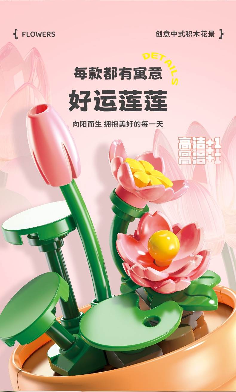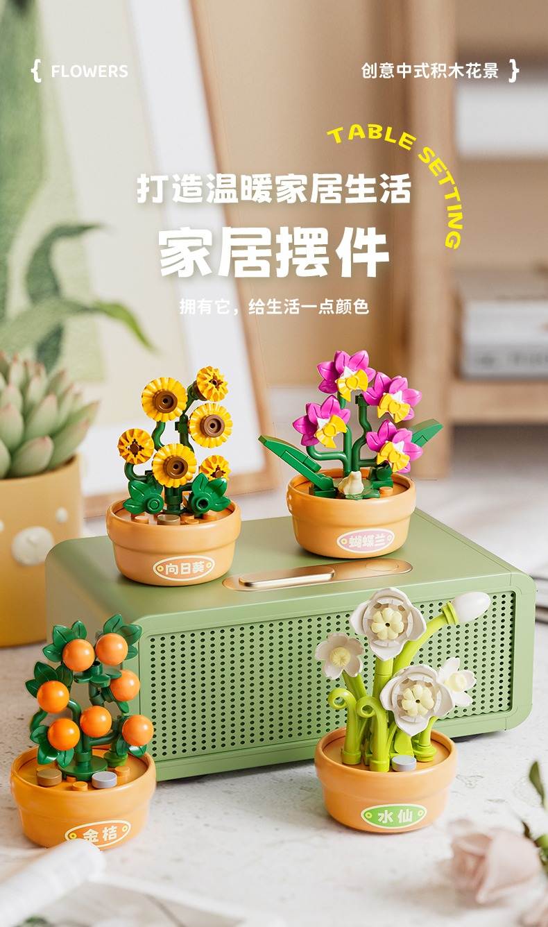 创意中式积木花景 9款 荷花、小雏菊、水仙、迎客松、向日葵、金桔、红玫瑰、鸿运腊梅、蝴蝶兰属于花卉植物系列积木套组。首发于2025年。