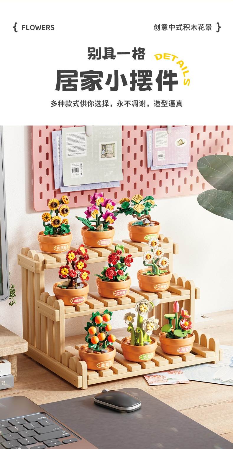 创意中式积木花景 9款 荷花、小雏菊、水仙、迎客松、向日葵、金桔、红玫瑰、鸿运腊梅、蝴蝶兰