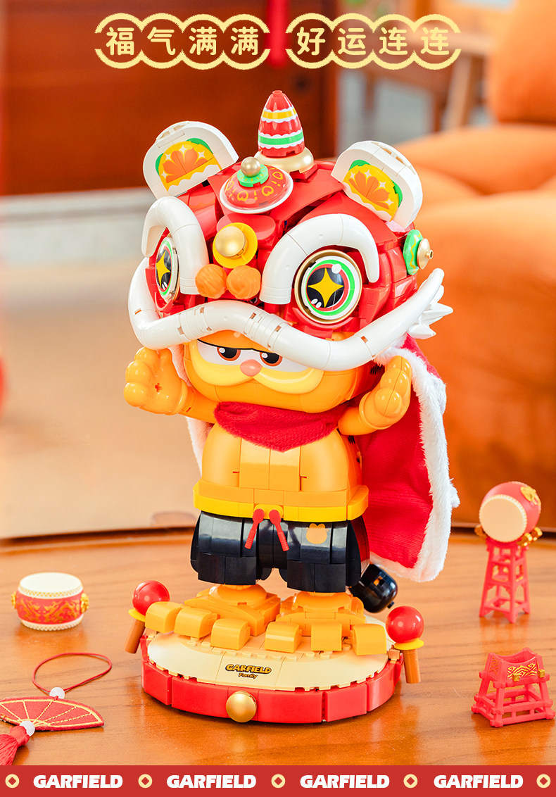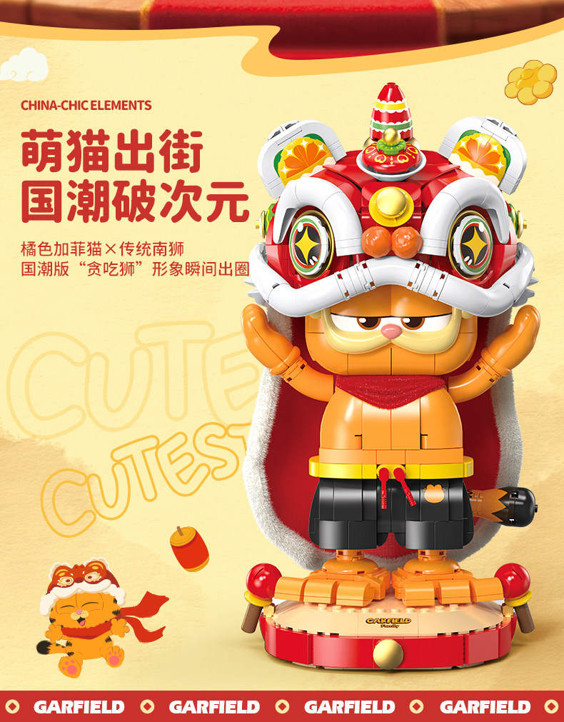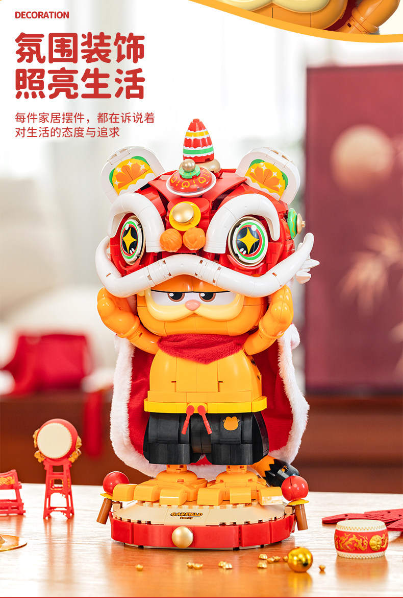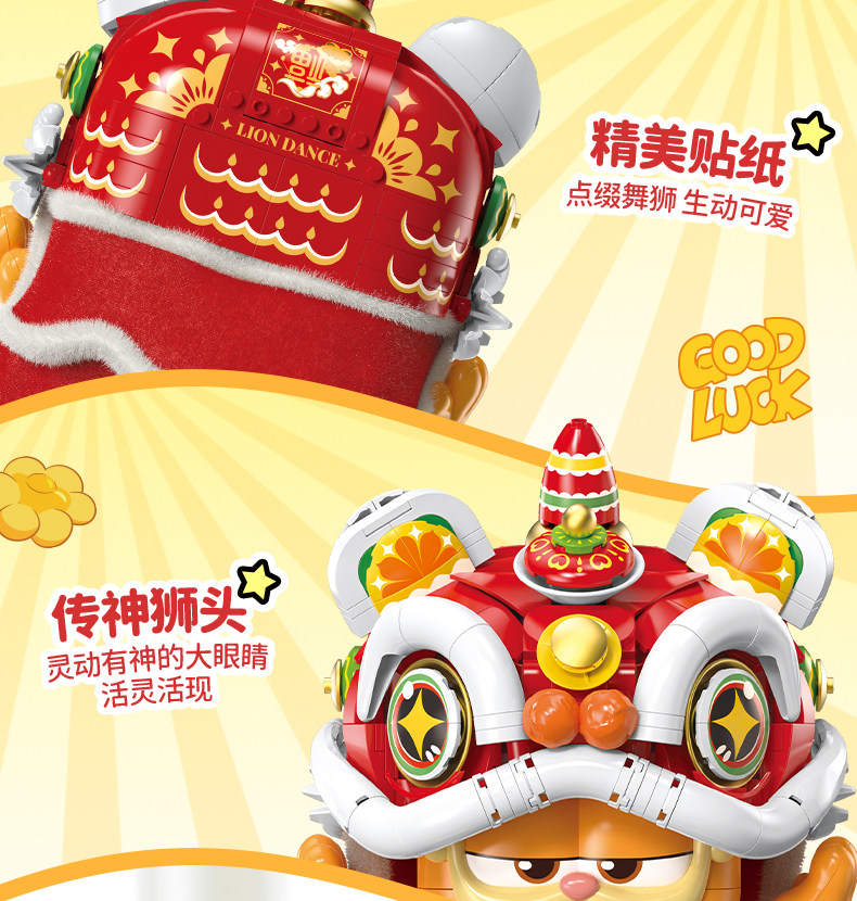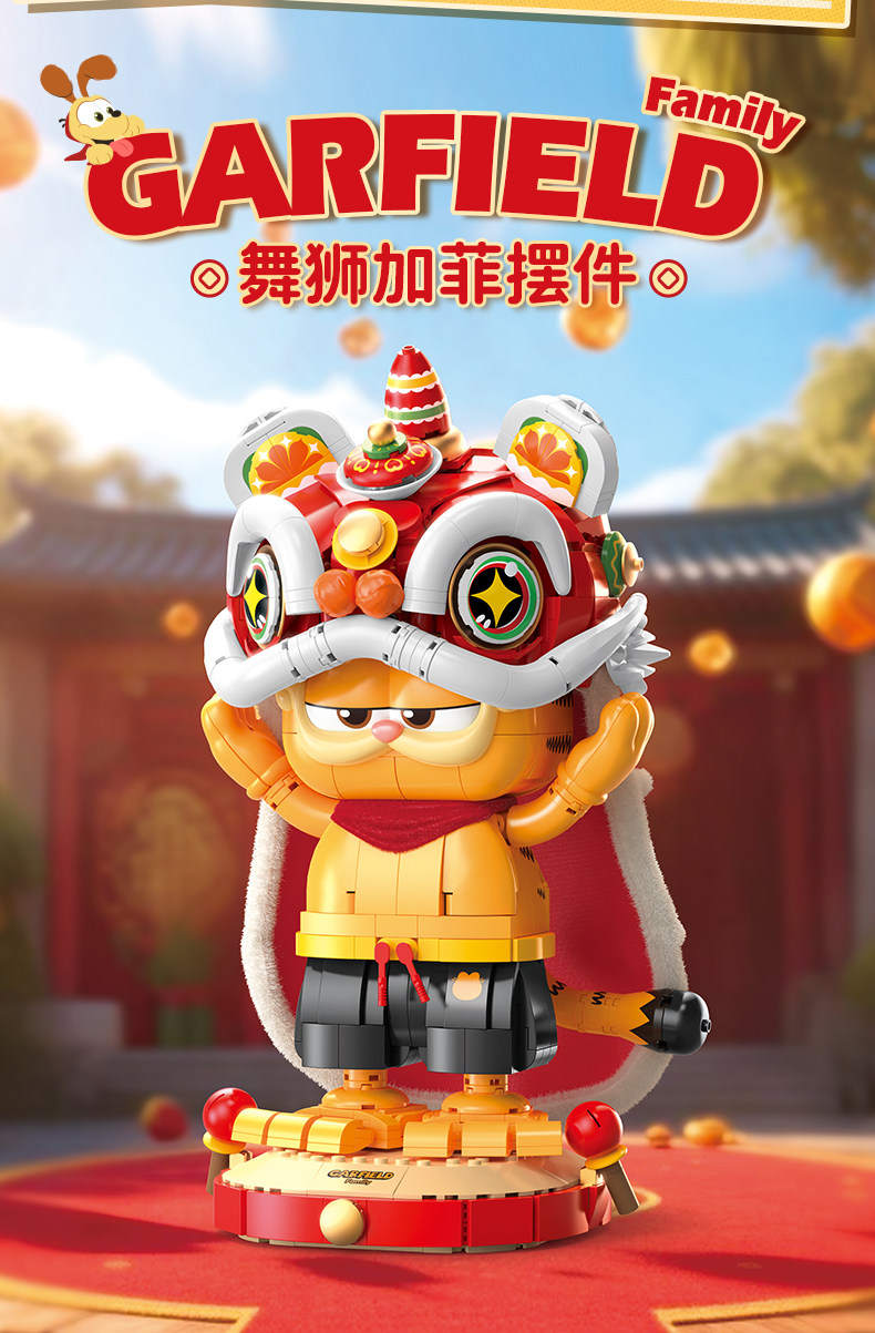 加菲猫家族:舞狮加菲猫(Garfield Family)属于影视游戏系列积木套组,整个套组包含 1369 个积木颗粒。首发于2025年。