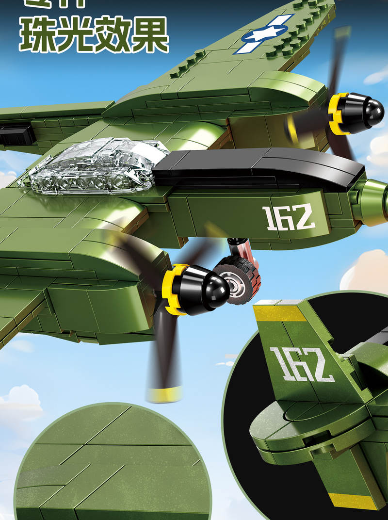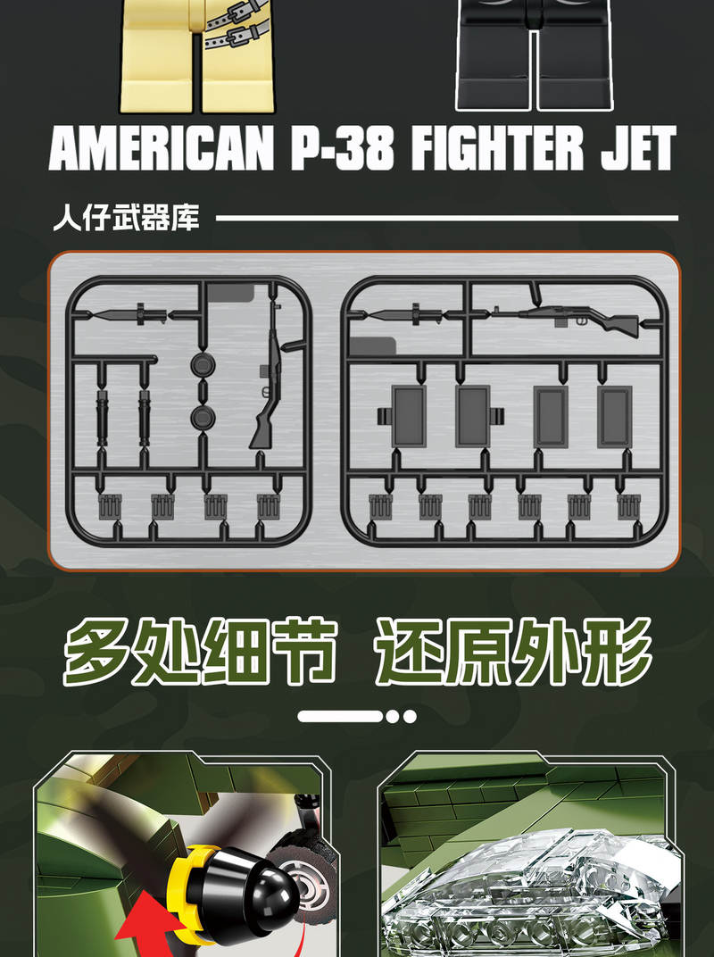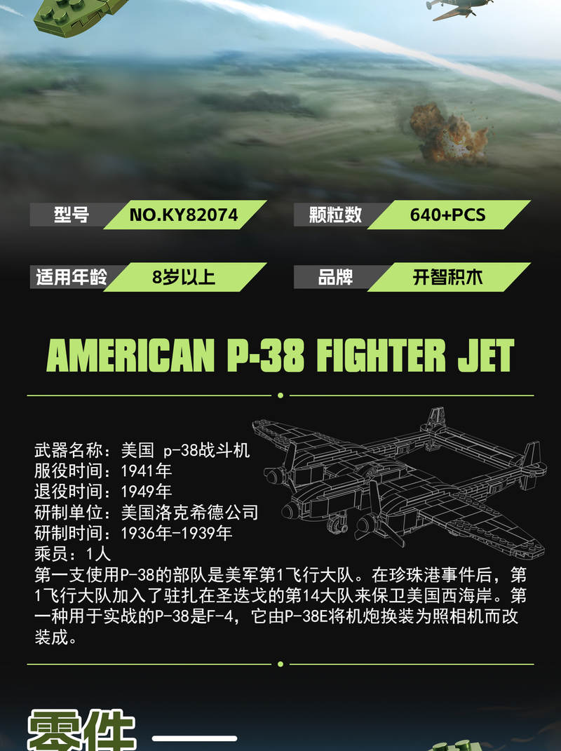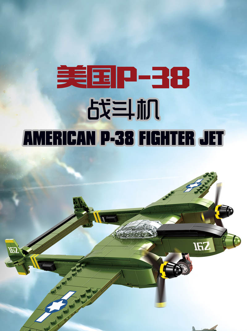 美国P-38战斗机(American P-38 Fighter Jet)属于军事系列积木套组,整个套组包含 640 个积木颗粒。首发于2025年。