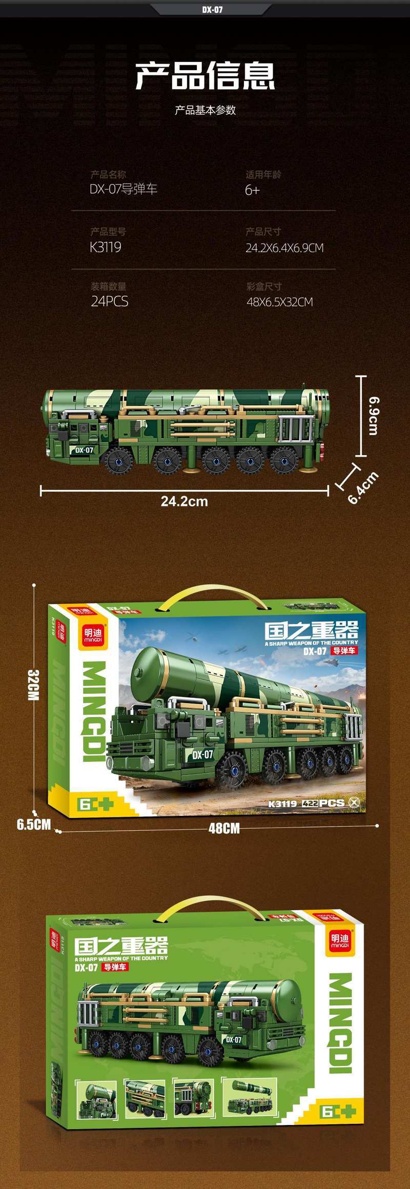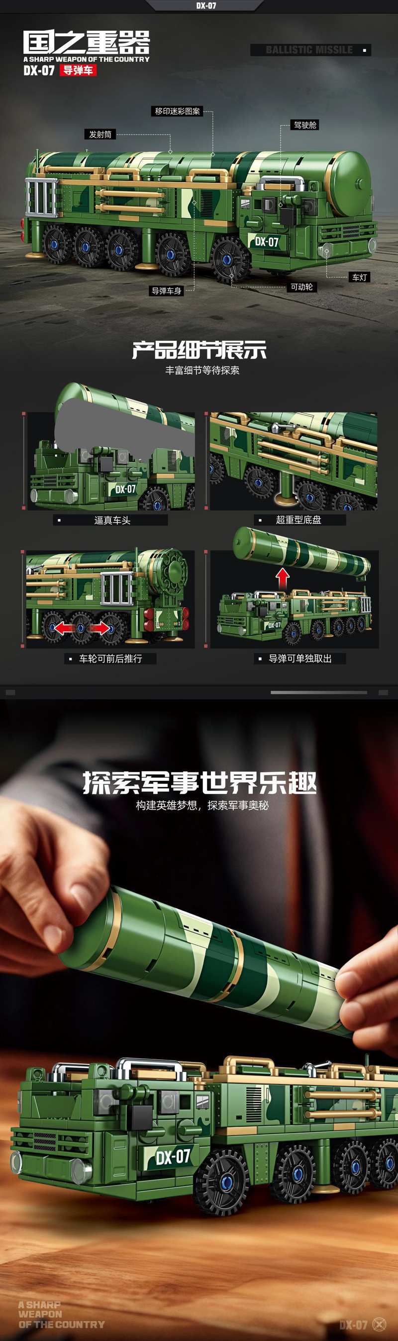 国之重器:DX-07导弹车属于军事系列积木套组,整个套组包含 422 个积木颗粒。首发于2025年。