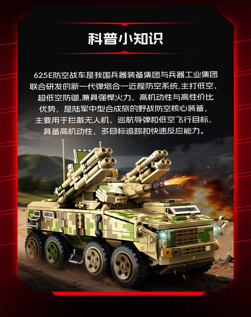 625E防空战车 1:28属于军事系列积木套组,整个套组包含 1007 个积木颗粒。首发于2025年。