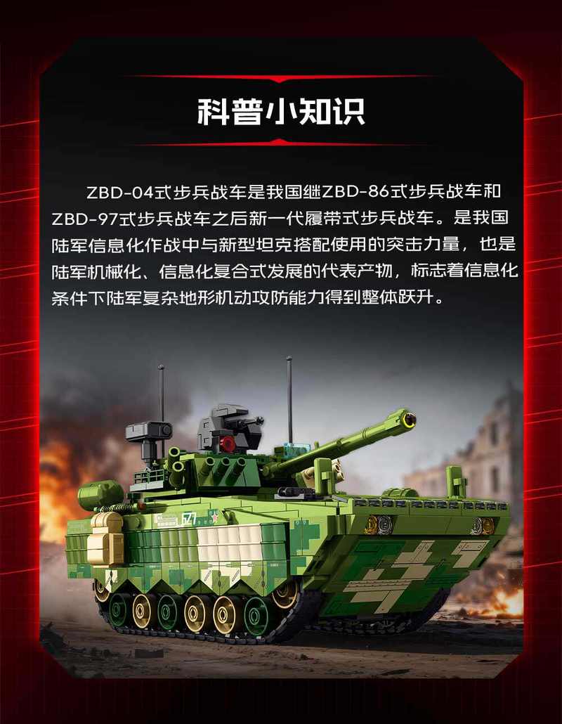ZBD-04步兵战车巷战版 1:31属于军事系列积木套组,整个套组包含 648 个积木颗粒。首发于2025年。
