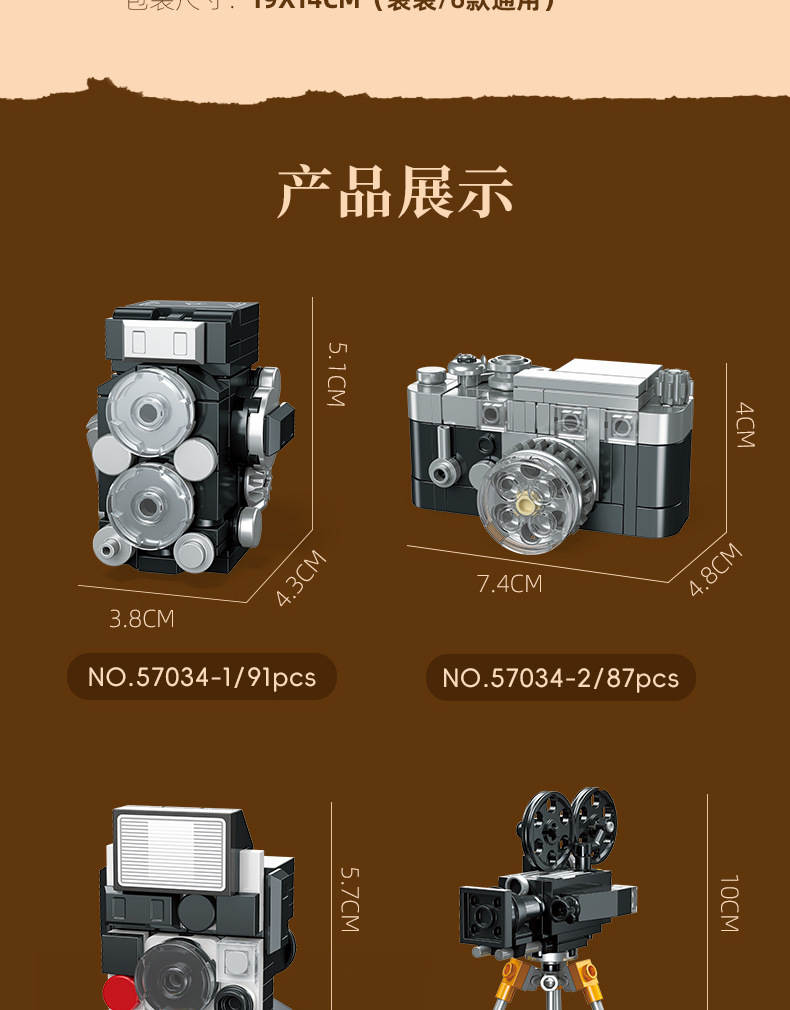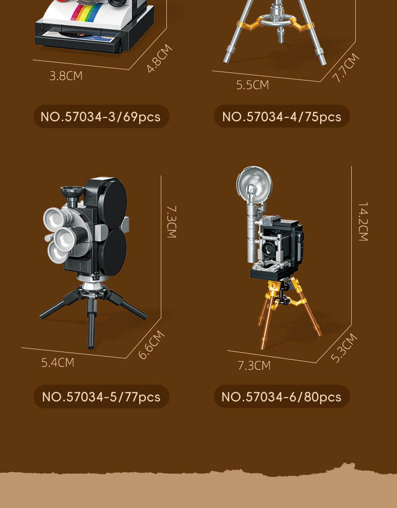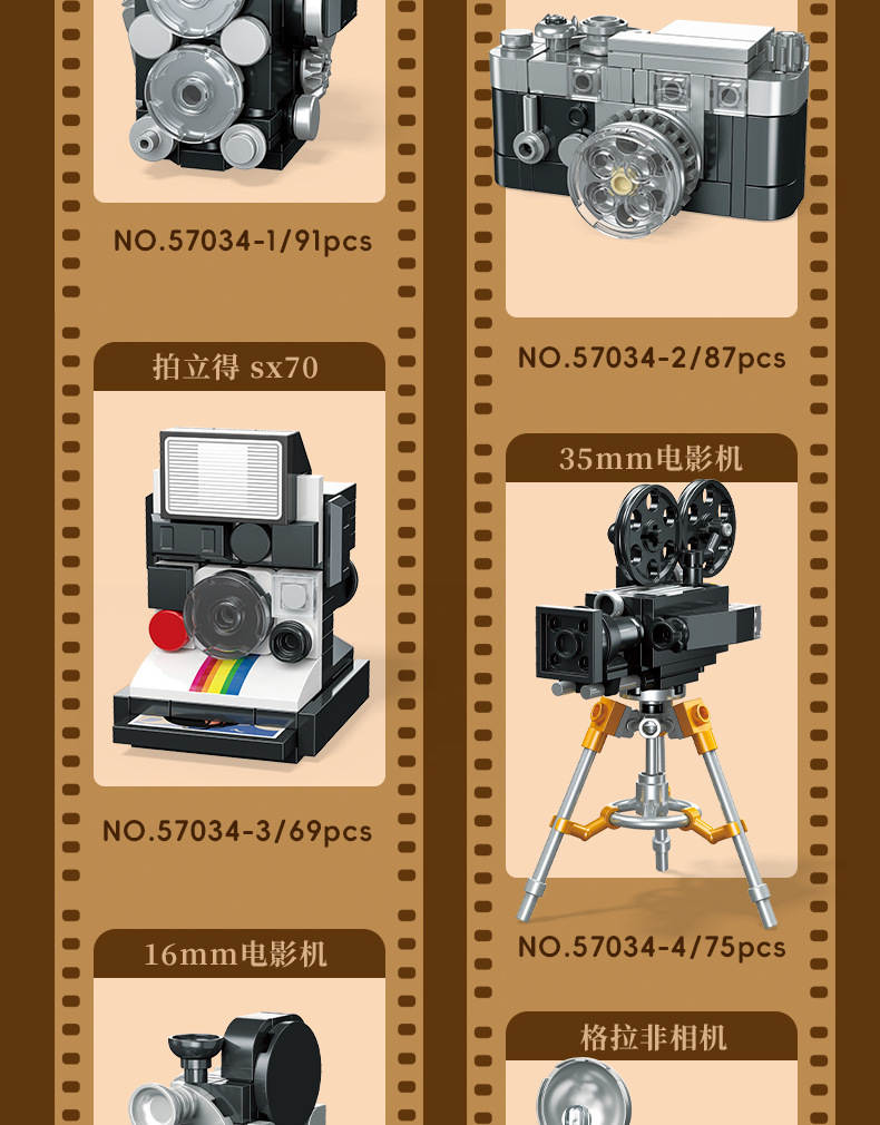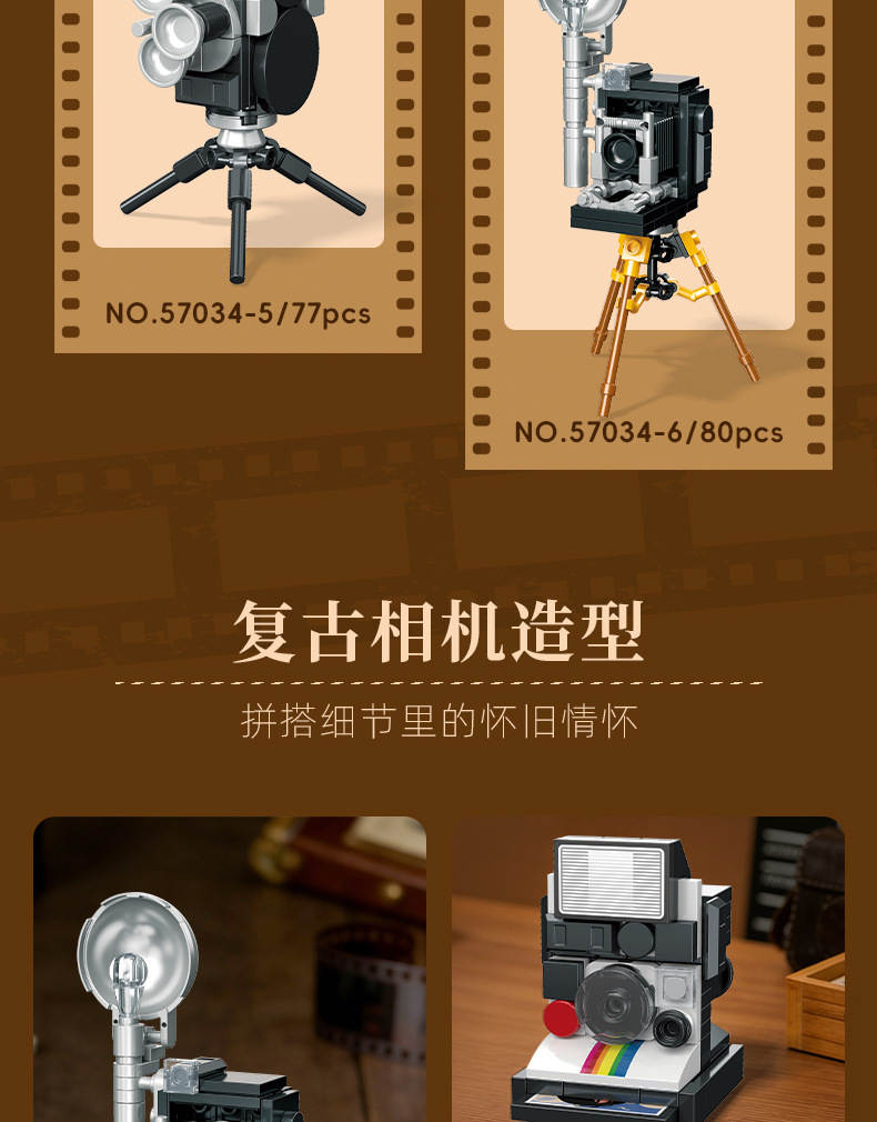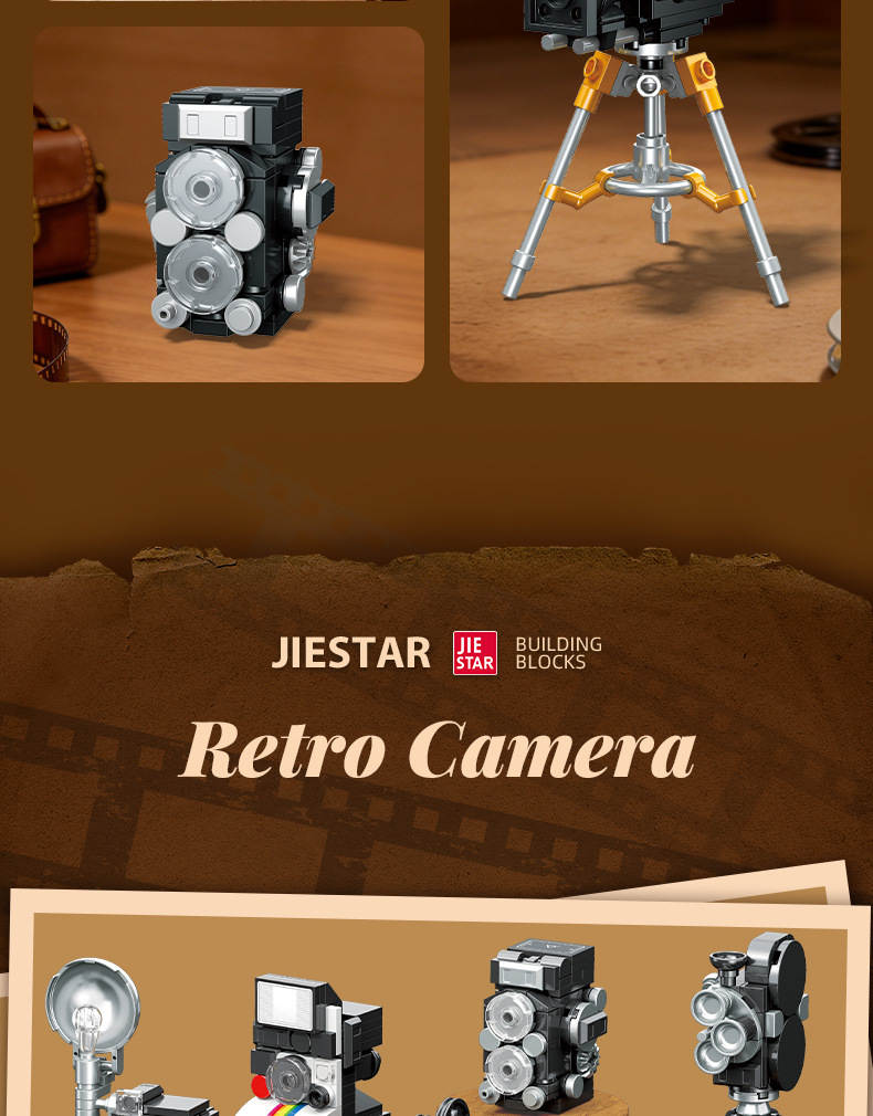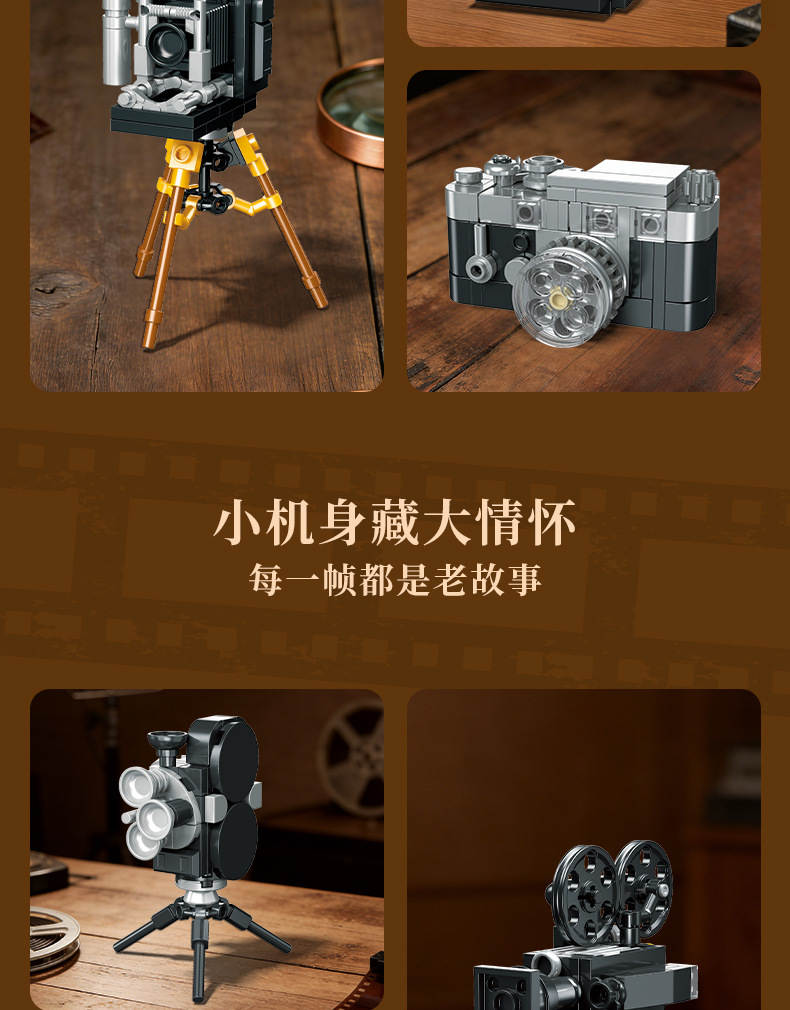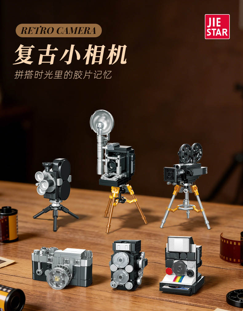 复古小相机 6款 录来2.8f、来卡M3、拍立得sx70、35mm电影机、16mm电影机、格拉非相机(Retro Camera)属于主题系列系列积木套组,整个套组包含 479 个积木颗粒。首发于2026年。