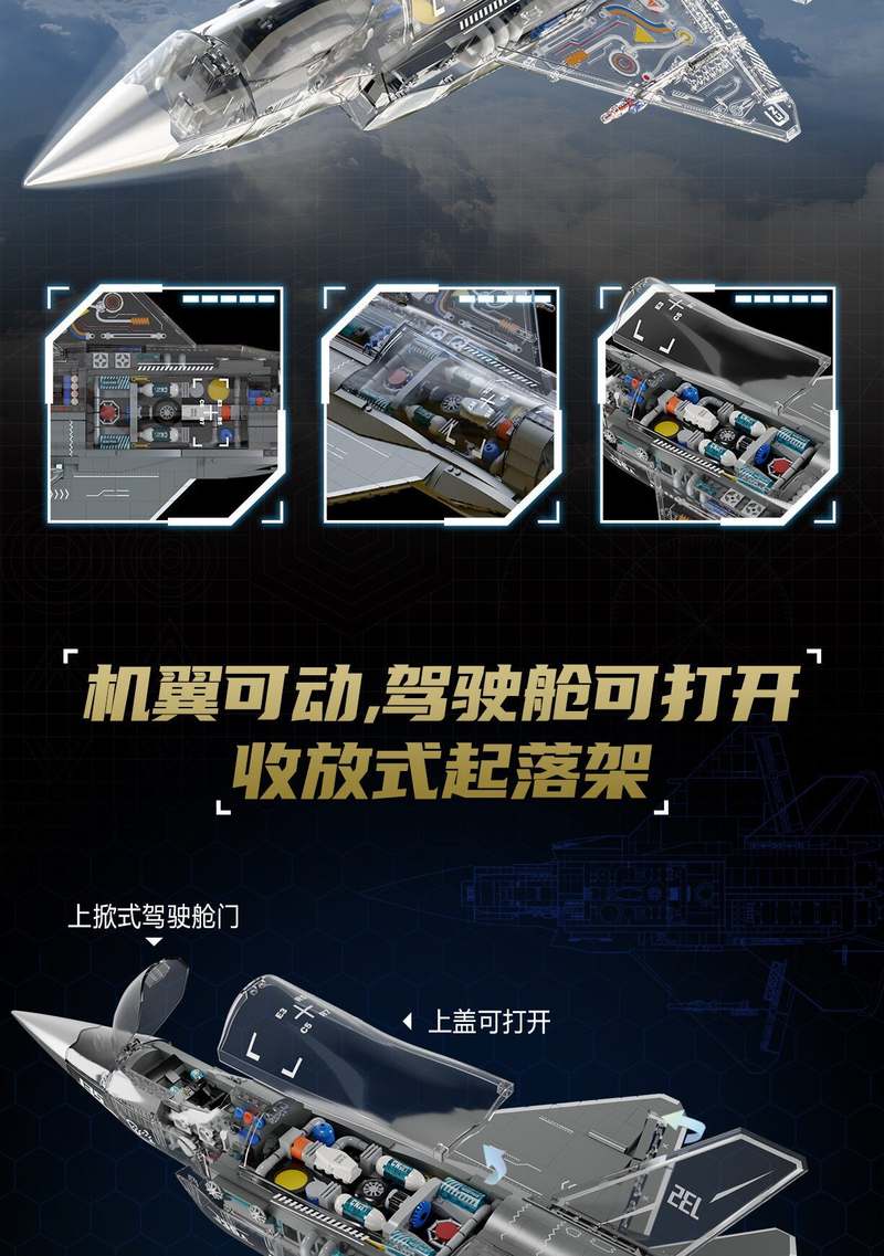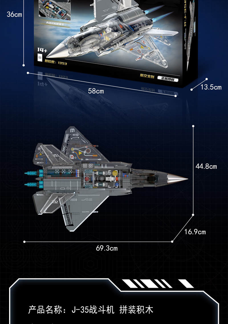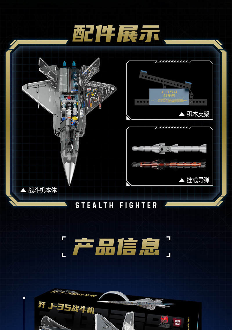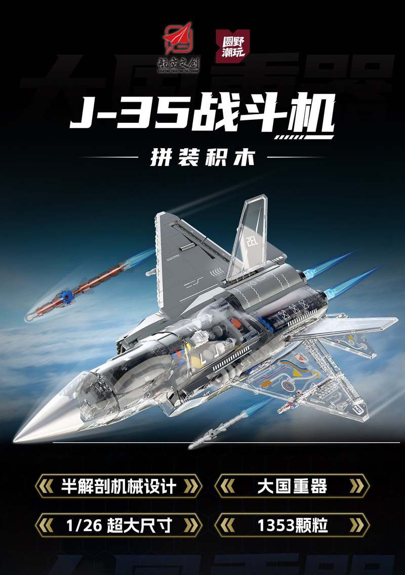 中航文化 歼 J-35战斗机 1:26属于军事系列积木套组,整个套组包含 1353 个积木颗粒。首发于2026年。