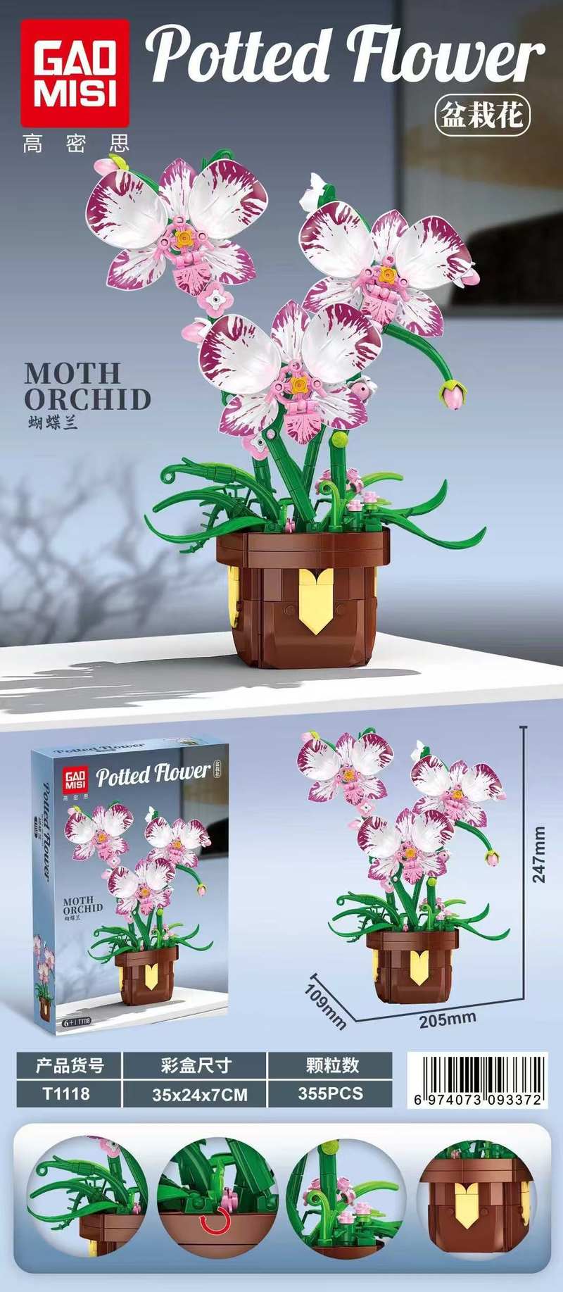 蝴蝶兰 盆栽花(Moth Orchid)属于花卉植物系列积木套组,整个套组包含 355 个积木颗粒。首发于2026年。