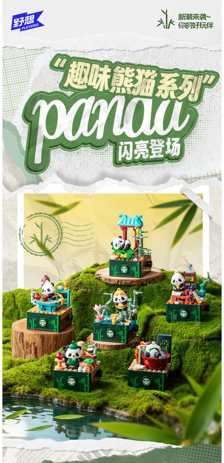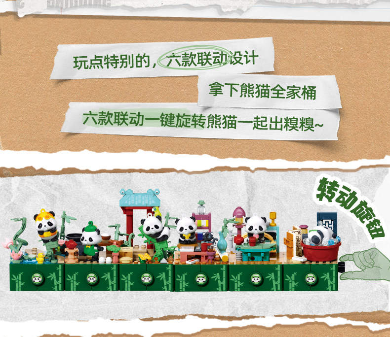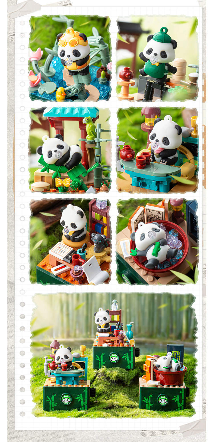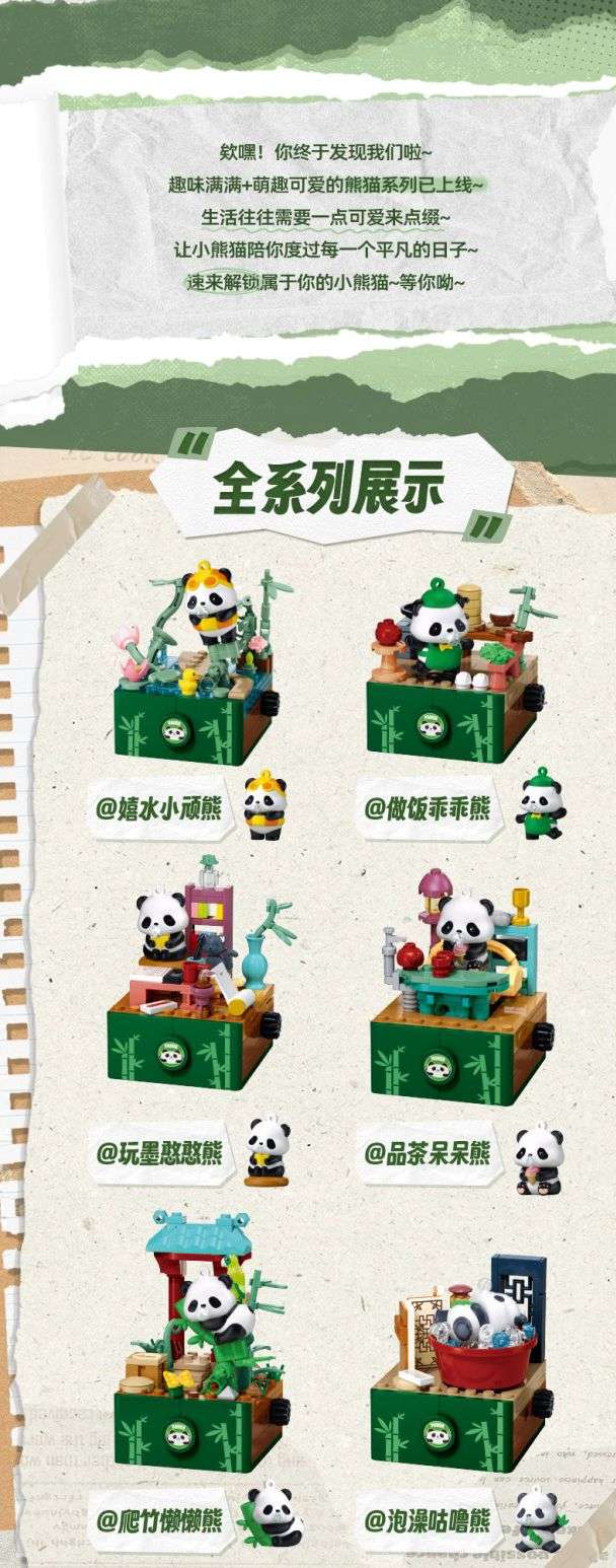 趣味熊猫 6款 嬉水小顽熊、做饭乖乖熊、玩墨憨憨熊、品茶呆呆熊、爬竹懒懒熊、泡澡咕噜熊(Panda)属于主题系列系列积木套组,整个套组包含 644 个积木颗粒。首发于2026年。