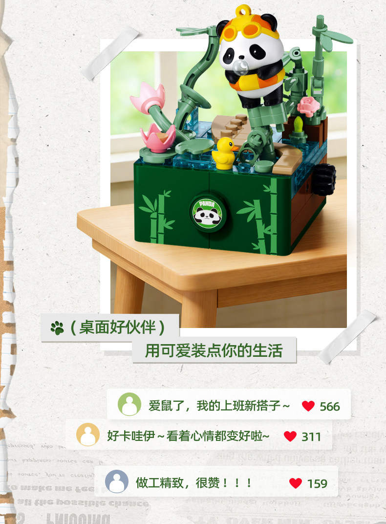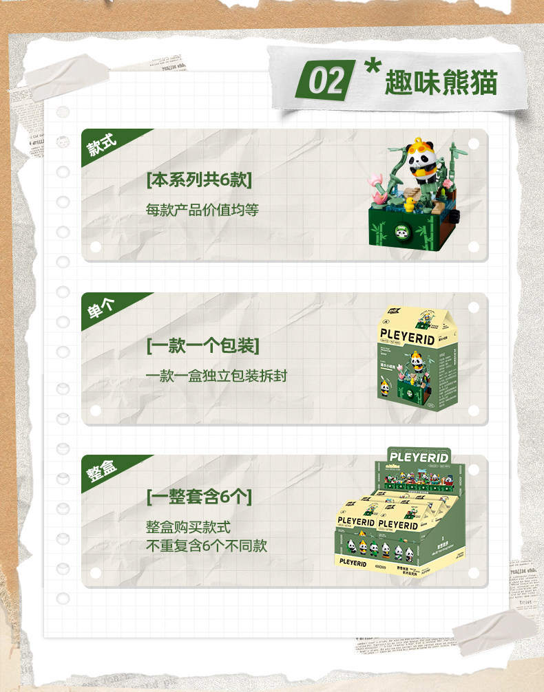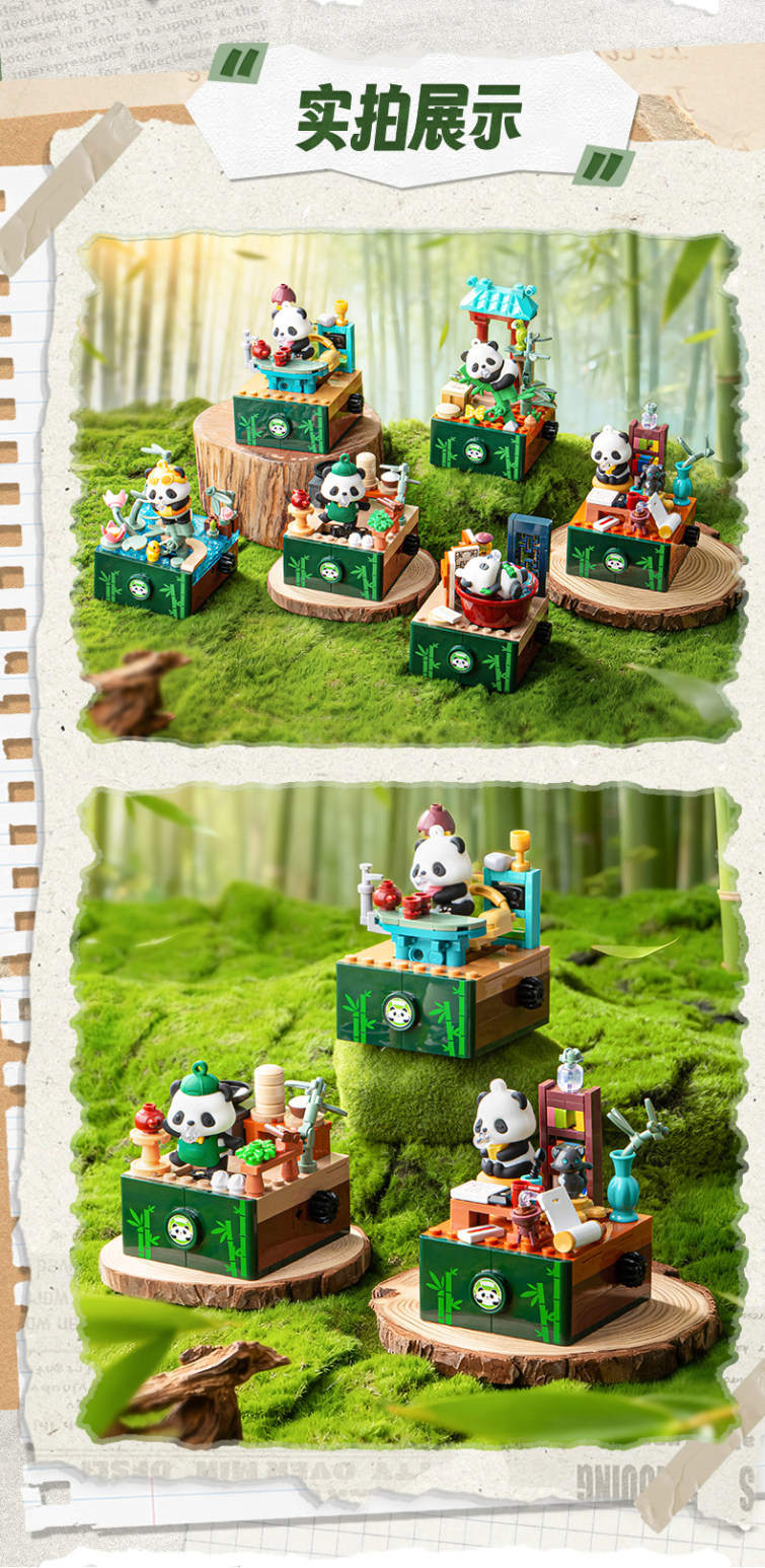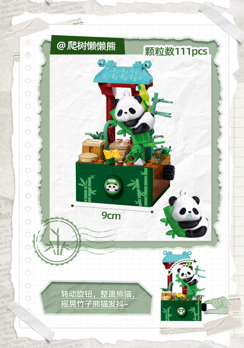 趣味熊猫 6款 嬉水小顽熊、做饭乖乖熊、玩墨憨憨熊、品茶呆呆熊、爬竹懒懒熊、泡澡咕噜熊(Panda)属于主题系列系列积木套组,整个套组包含 644 个积木颗粒。首发于2026年。