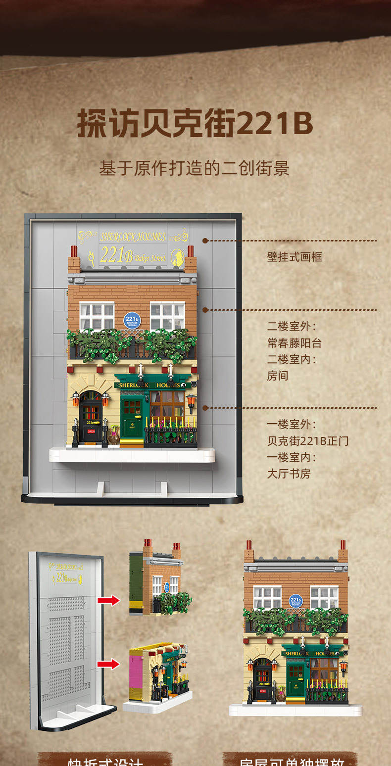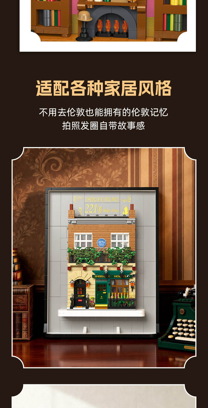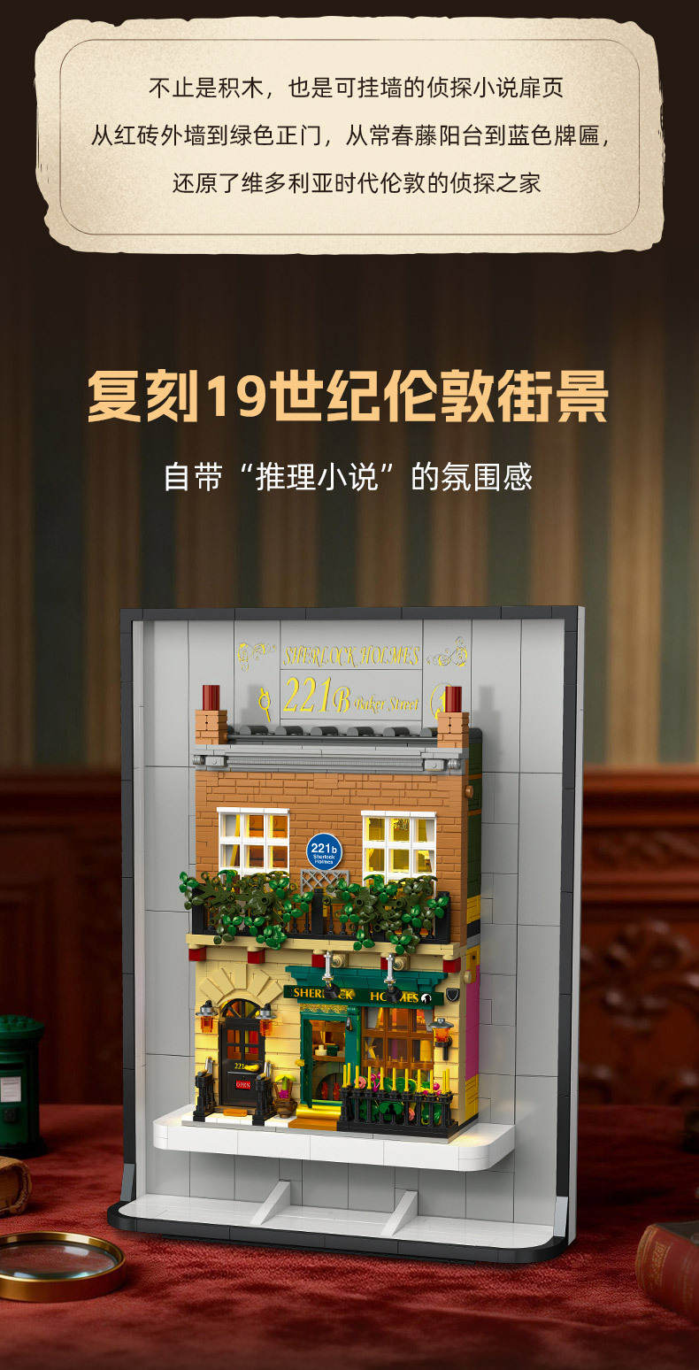 福尔摩斯纪念馆 探访贝克街221B(Sherlock Holmes Memorial Hall)属于艺术生活系列积木套组,整个套组包含 1755 个积木颗粒。首发于2026年。