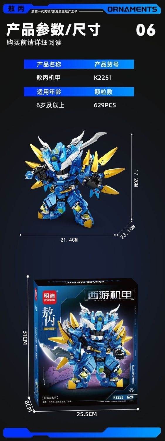 西游机甲:东海三太子 敖丙 国风摆件属于主题系列系列积木套组,整个套组包含 629 个积木颗粒。首发于2026年。