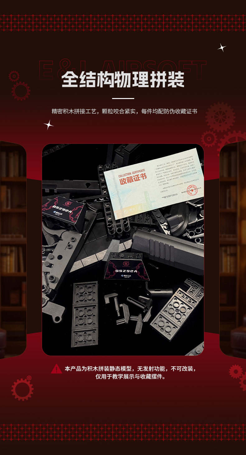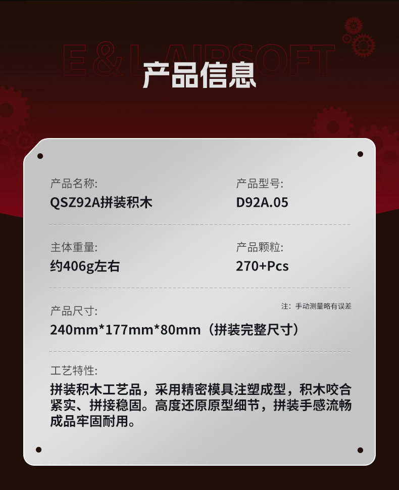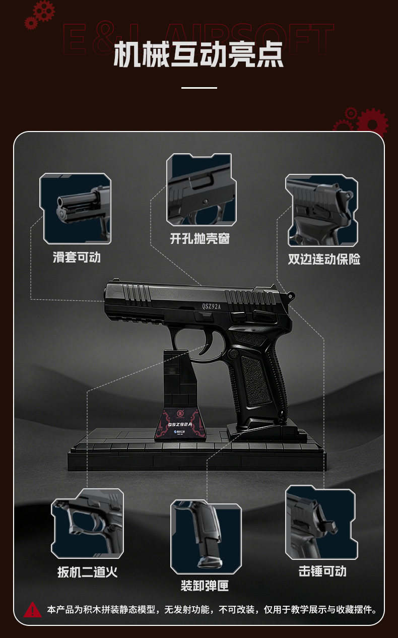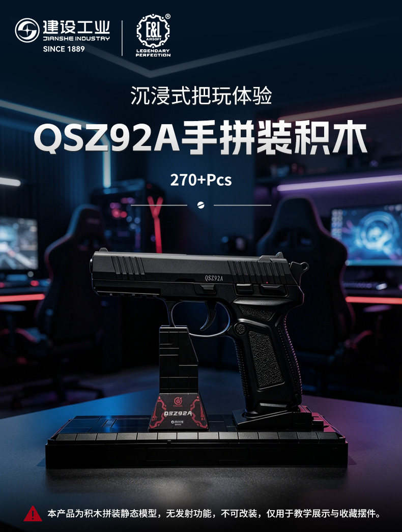 重庆建设工业E&L QSZ92式半自动手枪属于积木枪系列积木套组,整个套组包含 270 个积木颗粒。首发于2026年。